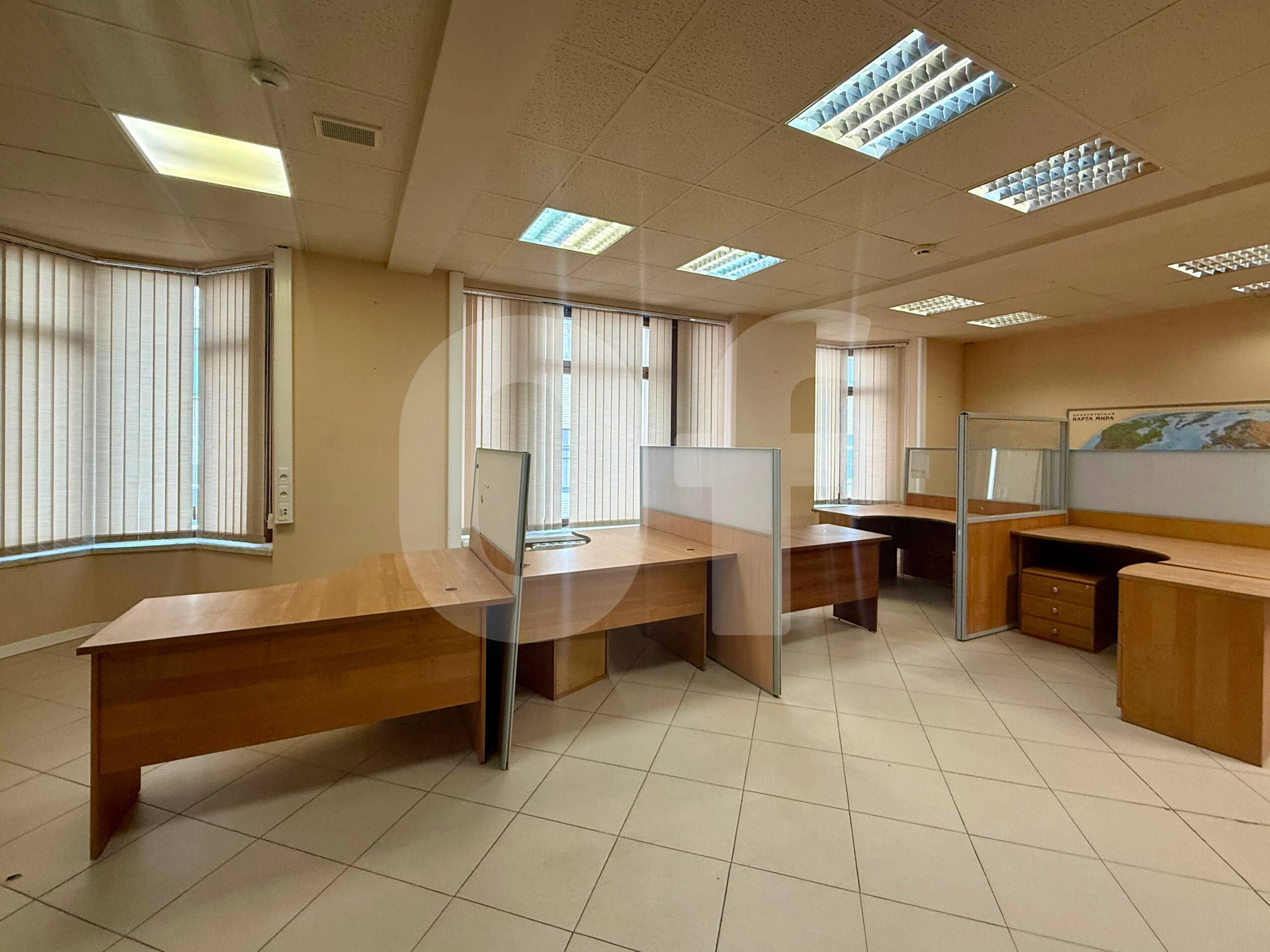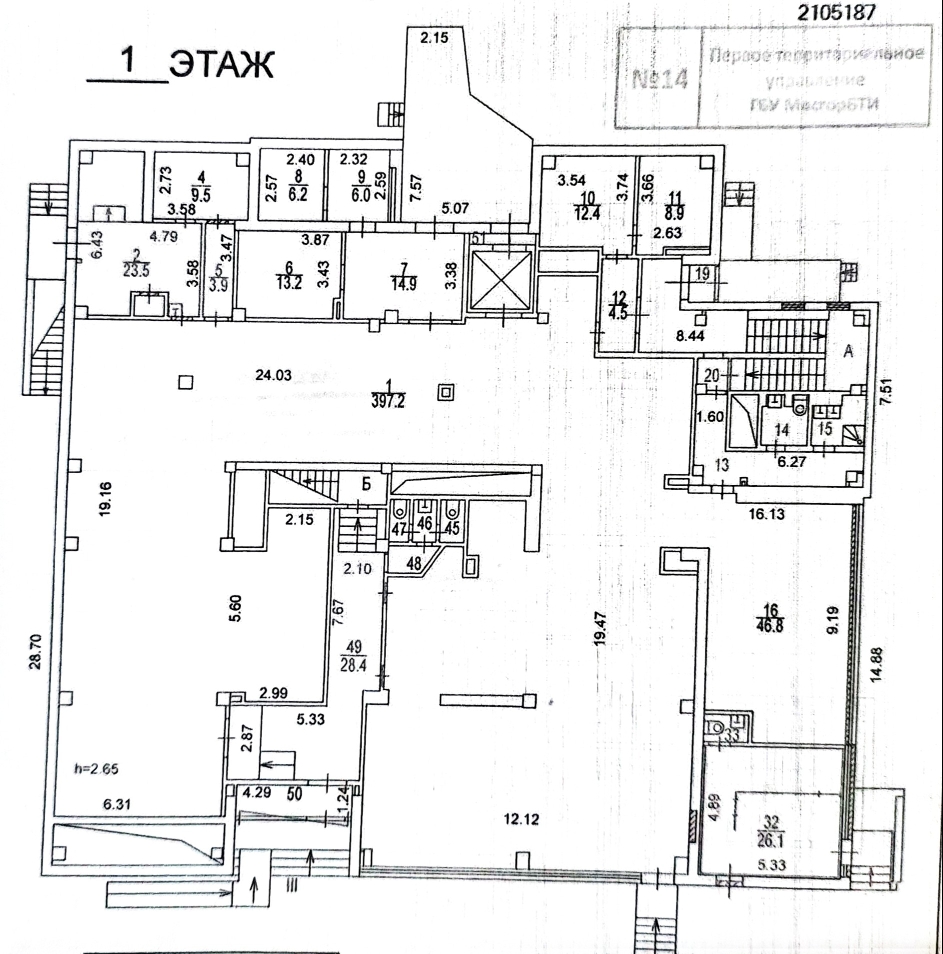 - 1-й этаж: 636 м2, высота потолков от 2,65 до 3,25 м. Этот этаж имеет свободную планировку и используется под торговые залы и склады. Здесь расположены четыре санузла.