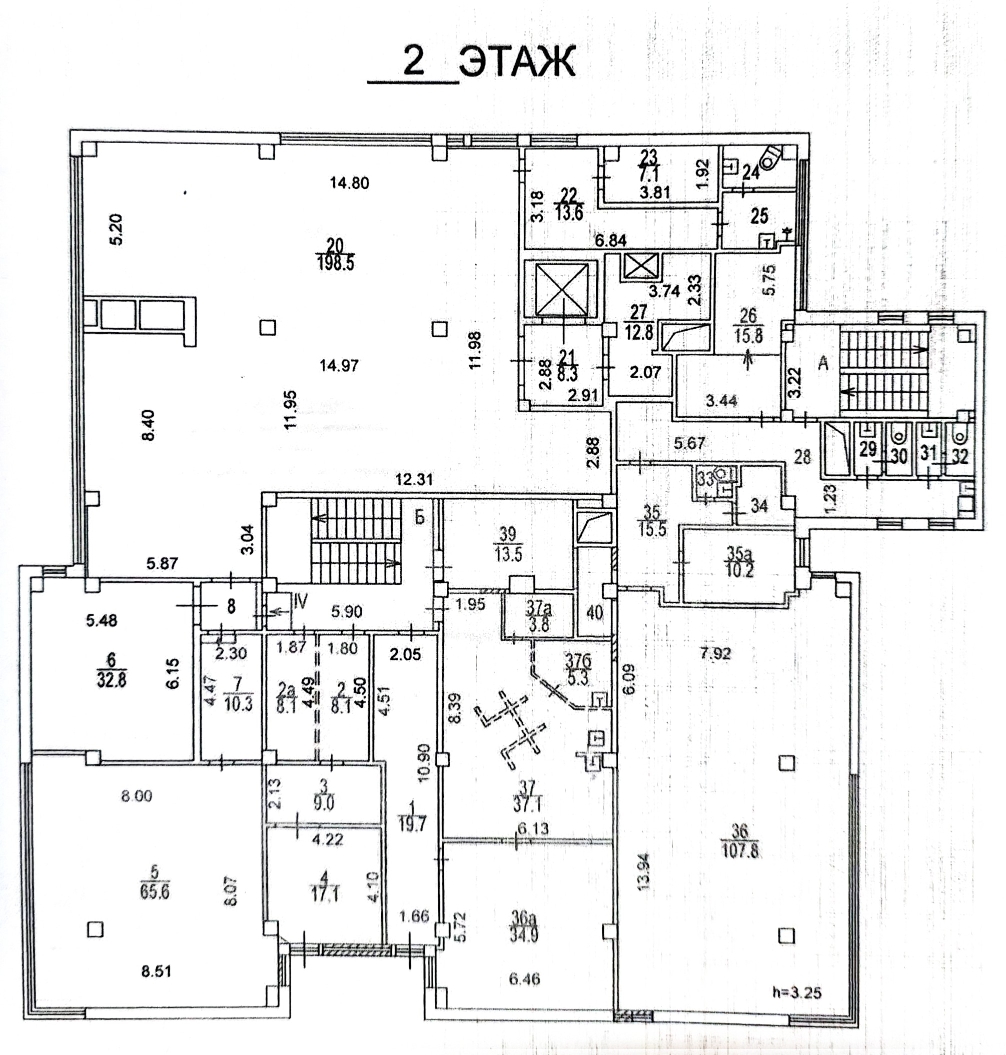 - 2-й этаж: 700 м2, высота потолков 3,25 м. Этаж имеет свободную планировку и используется под торговые залы.