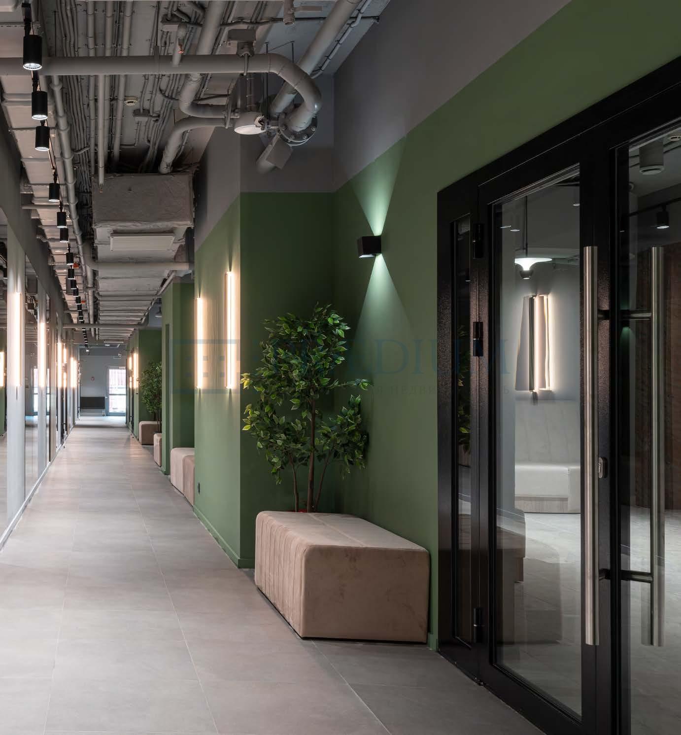 С мебелью. Приточно-вытяжная вентиляция. Центральное кондиционирование. Пожарная сигнализация. Интернет, телефония. Охрана. Видеонаблюдение. Система контроля доступа. Лифты: 6 шт., Schindler. Подземная парковка. Наземная парковка.