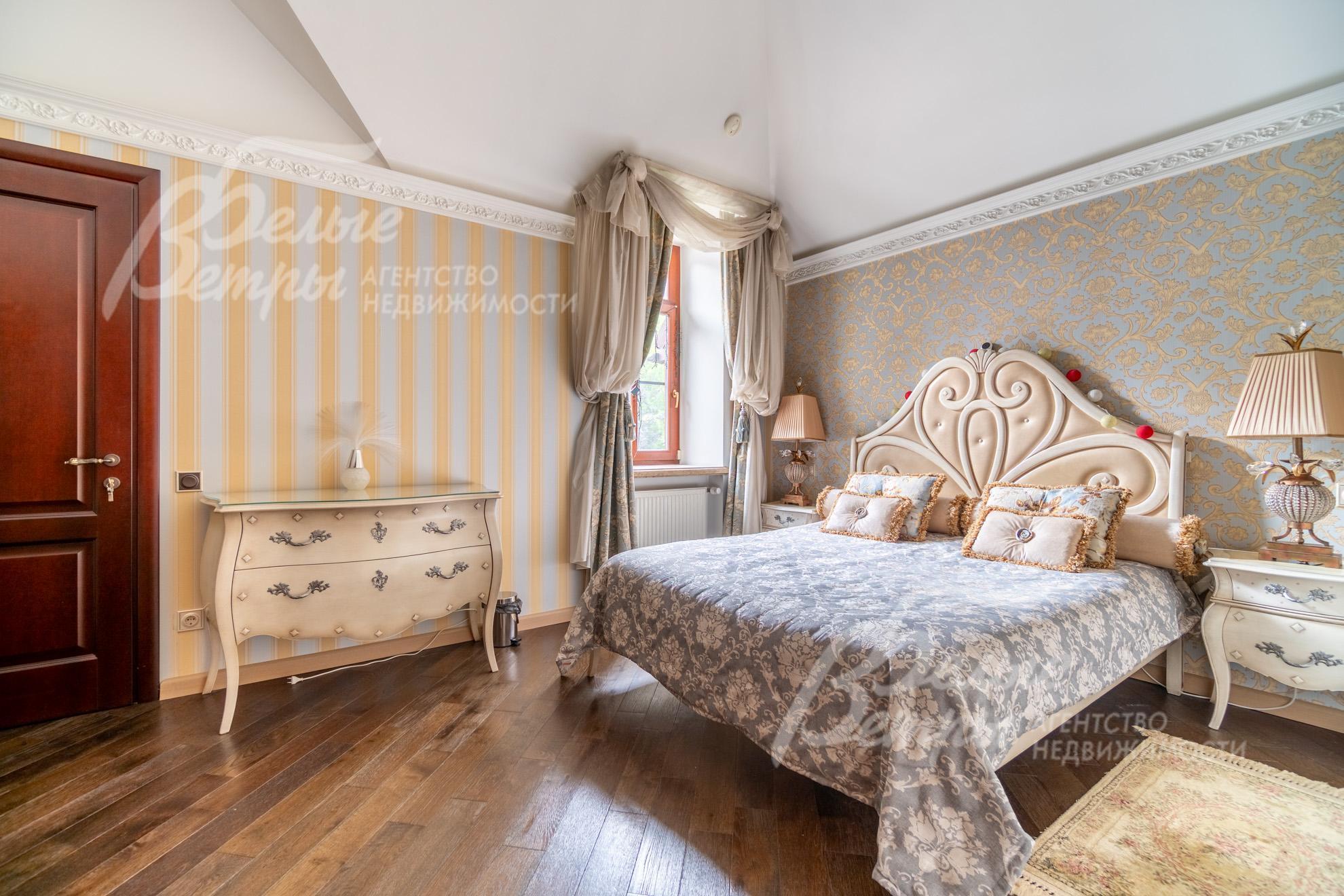 Меблированный дом с выразительной архитектурой: деревянные балки имитируют фахверк в баварском стиле. В планировке широкие возможности для отдыха и досуга: на цокольном этаже оборудованный кинотеатр, спа-зона с сауной и бассейном с чашей 8.82.8 м, спортзал; гостиная со вторым светом и камином, есть отдельная квартира для персонала. В классической изысканной отделке премиальные европейские материалы, натуральный мрамор, эксклюзивная лепнина по авторским эскизам. Дом обставлен дорогостоящей итальянской мебелью из массива дерева. Участок оформлен по авторскому ландшафтному проекту с элементами паркового и лесного дизайна. Участок расположен в элитном строго охраняемом коттеджном посёлке с центральными коммуникациями у леса в 300 м от благоустроенного пруда.