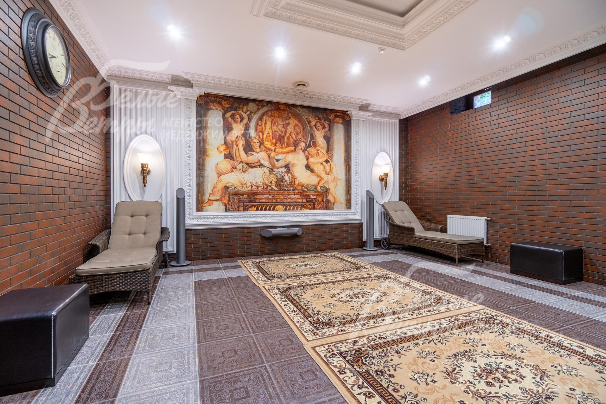 Внутренняя отделка: роскошная отделка в классическом стиле выполнена по индивидуальному дизайн-проекту одного из пяти ведущих дизайнеров России с обширным применением натурального мрамора и декоративной гипсовой лепнины. В оформлении стен преобладает клинкерная плитка под кирпич (общая площадь плитки – 1500 кв.м) с декором из гипса по индивидуальным эскизам, выполненным на месте работ (узорчатые панно, карнизы, полуколонны и другие элементы). В спальнях (кроме мастер-спальни) – шелковые обои (Франция). В санузлах – плитка (в санузле при мастер-спальне – оникс). На полу в общих зонах – мрамор (Emperador Dark, общая площадь 400 кв.м) с водяным подогревом, в спальнях – доска из морёного дуба. Потолки – многоуровневые с широкими гипсовыми карнизами. Установлены межкомнатные двери из массива дуба, часть из них – со вставками из зеркал (производство Новый интерьер), дорогостоящая входная дверь, мраморные подоконники (Emperador Dark). Системы освещения, включающие розетки под люстры и точечные светильники, создают эстетичное обрамление для фресок на античные сюжеты. На второй этаж ведёт железобетонная лестница со ступенями, отделанными мрамором (Emperador White), перилами художественной ковки, поручнями из массива дуба, декоративная отделка нижней части лестничного марша выполнена с использованием гипсовых элементов, изготовленных по авторским эскизам на объекте. Гостиную украшает двухсторонний камин гильотинного типа, облицованный мрамором двух видов. В спа-зоне чаша бассейна отделана мозаикой, в парной – канадский кедр..
