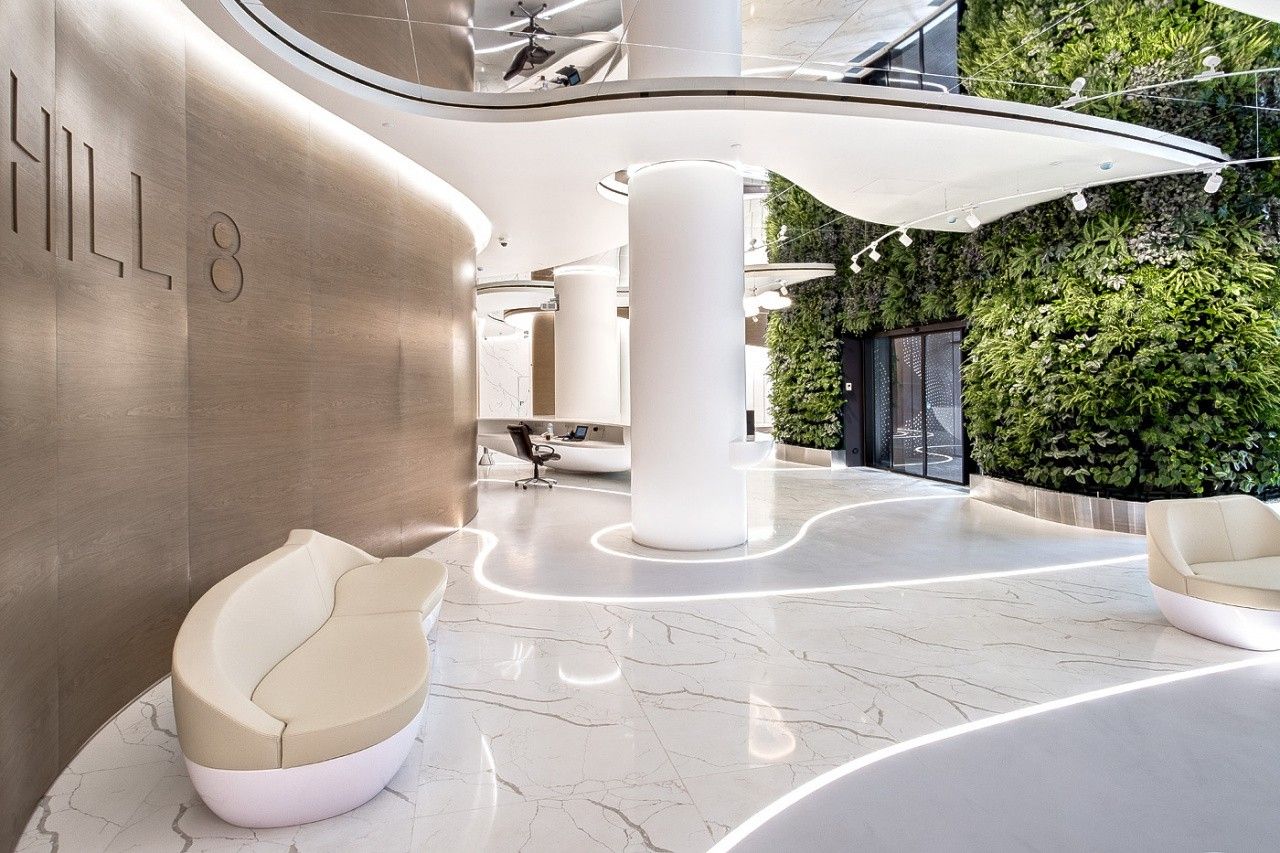 Бизнес-центр состоит из двух корпусов, вписанных в природный ландшафт. Такой эффект достигается благодаря концептуальным решениям: имитации растительных форм и интеграции природных элементов в объект.