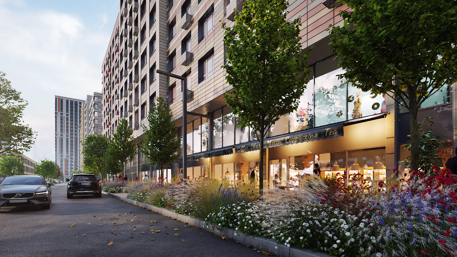 Внутренние дворы со сквозным проходом и общественные пространства соединяют воедино территорию, а богатая инфраструктура первых этажей делает жизнь в комплексе комфортной и разнообразной.