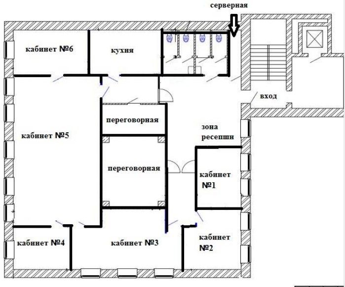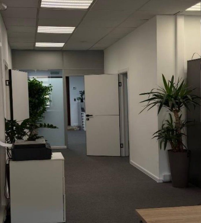 В блоке есть несколько кабинетов, переговорные комнаты, кухня, санузлы и зона ресепшен.