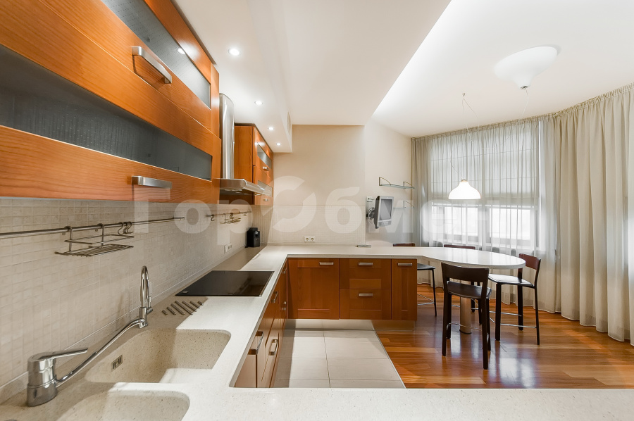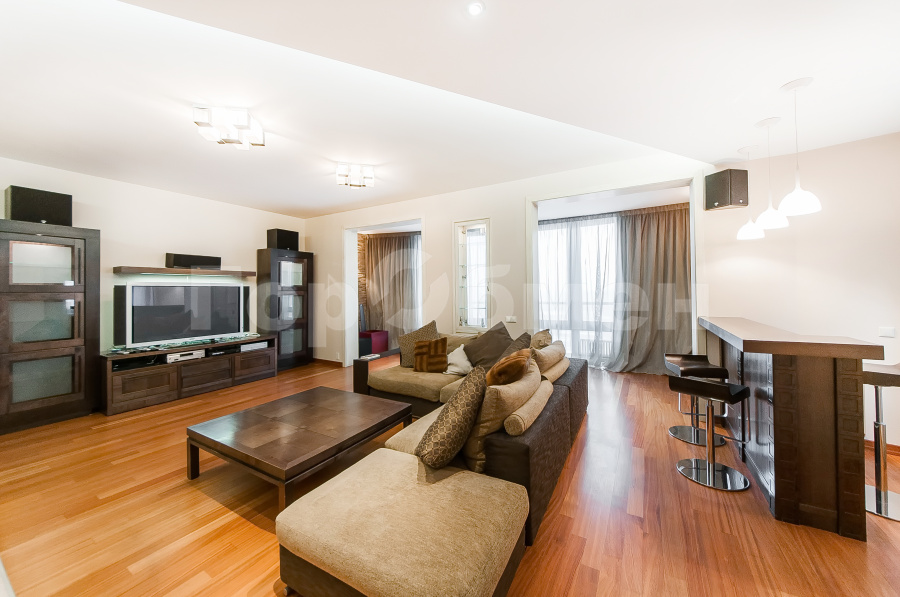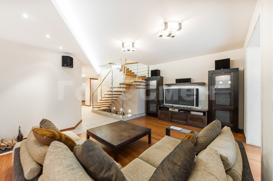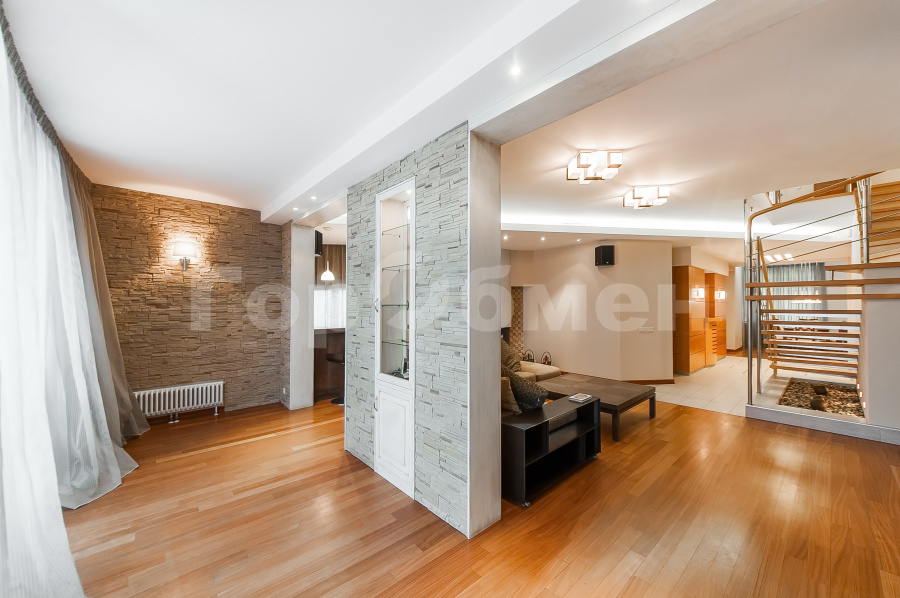 Планировка представляет собой два уровня общей площадью 224,4 кв.м с великолепными видами на город и дизайнерской отделкой.