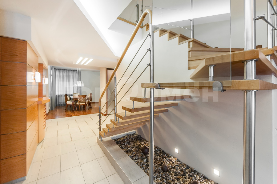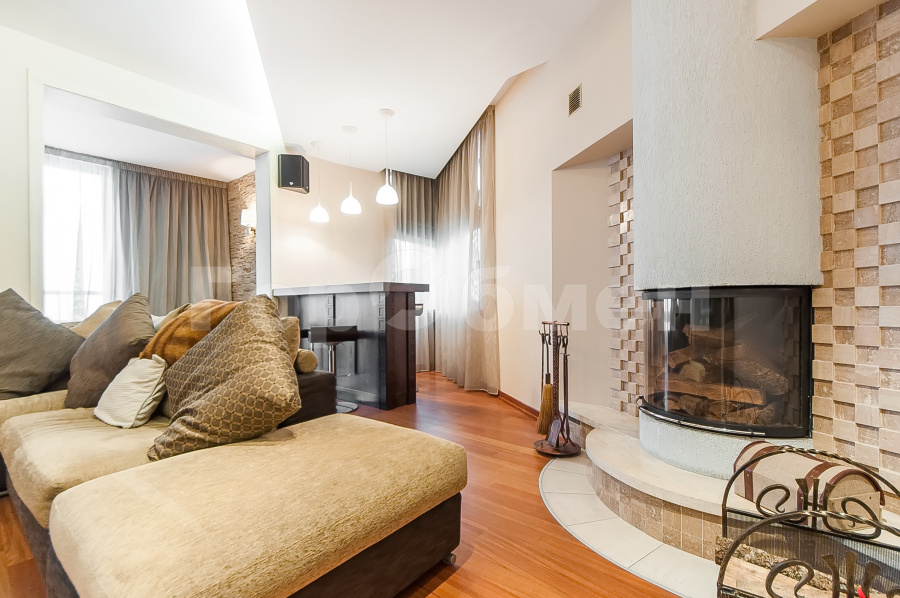 На 1-ом уровне размещена функциональная кухня площадью 17,9 кв.м, гостиная с панорамным остеклением, которое открывает красивый вид на Москву-Сити, каминный зал, гардеробная, санузел с душевой кабиной.