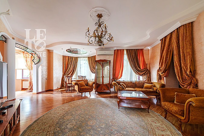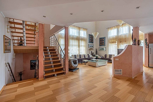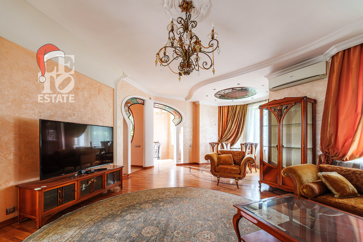 Внутренняя отделка выполнена из дорогостоящих материалов. Полы выложены керамогранитом и дубовым паркетом. Стены отделаны венецианской штукатуркой. Все витражи в доме ручной работы. Кухня оснащена всей необходимой встроенной техникой от фирм: Bosch, Miele, Liebherr. Дом оснащен системой теплых полов, в каждой жилой комнате установлено кондиционирование. Лестница сделана из дубового массива с элементами ручной ковки. Вся мебель в доме выполнена по индивидуальному заказу. Приятным дополнением к дому служат два дровяных камина, а так же зона SPA, которая включает в себя бассейн и электрическую сауну.