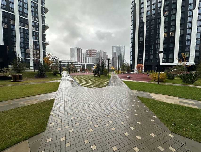 Расположено вдоль дороги, рядом подземный переход, соединяющий все кварталы жилого комплекса.