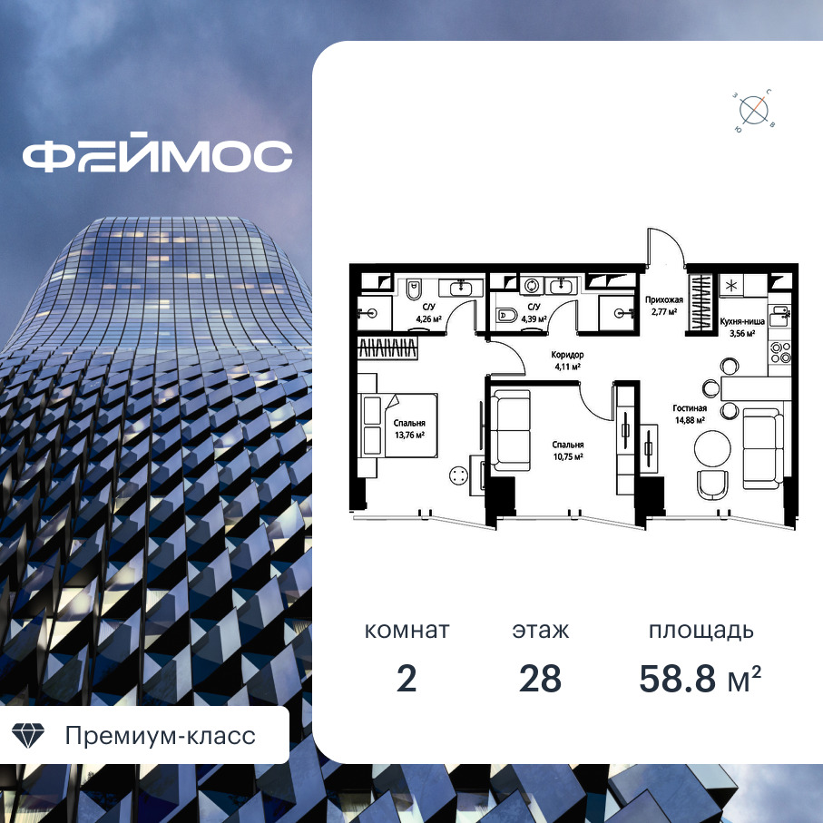 Продаётся 2-к квартира общей площадью 58.80 кв. м с предчистовой отделкой на 28-м этаже премиального небоскреба Феймос.