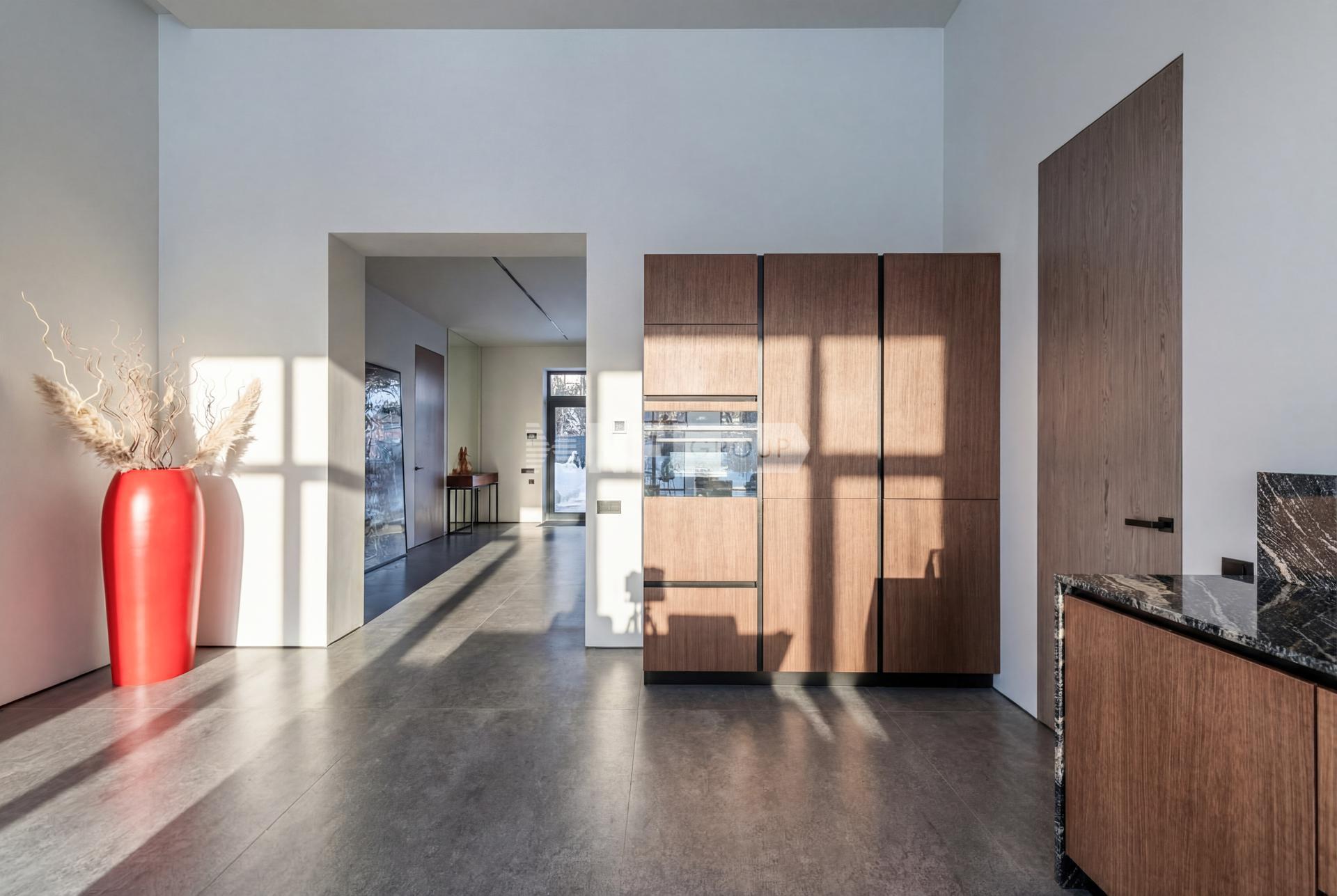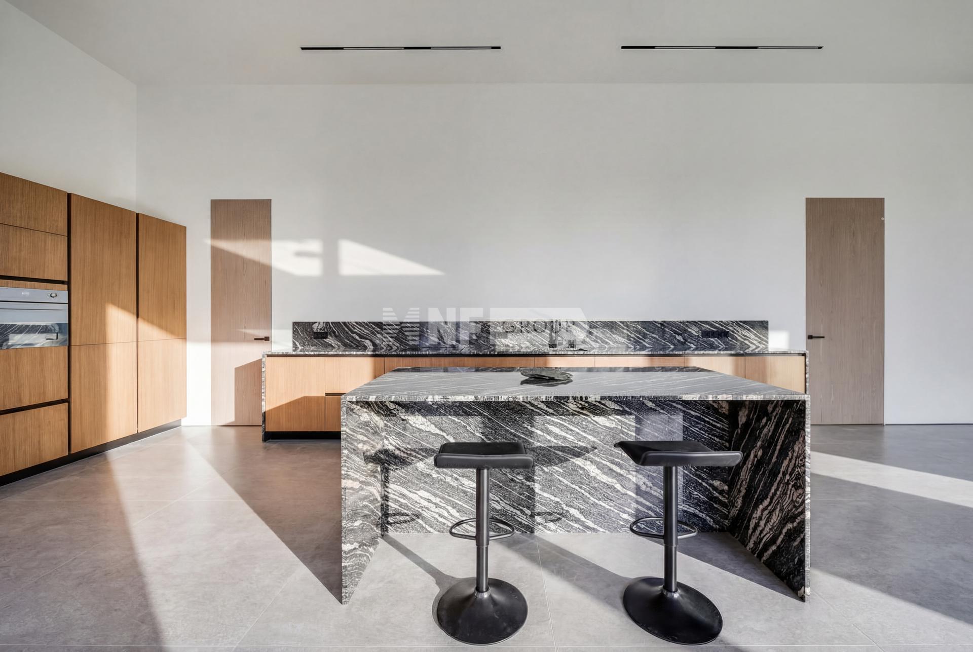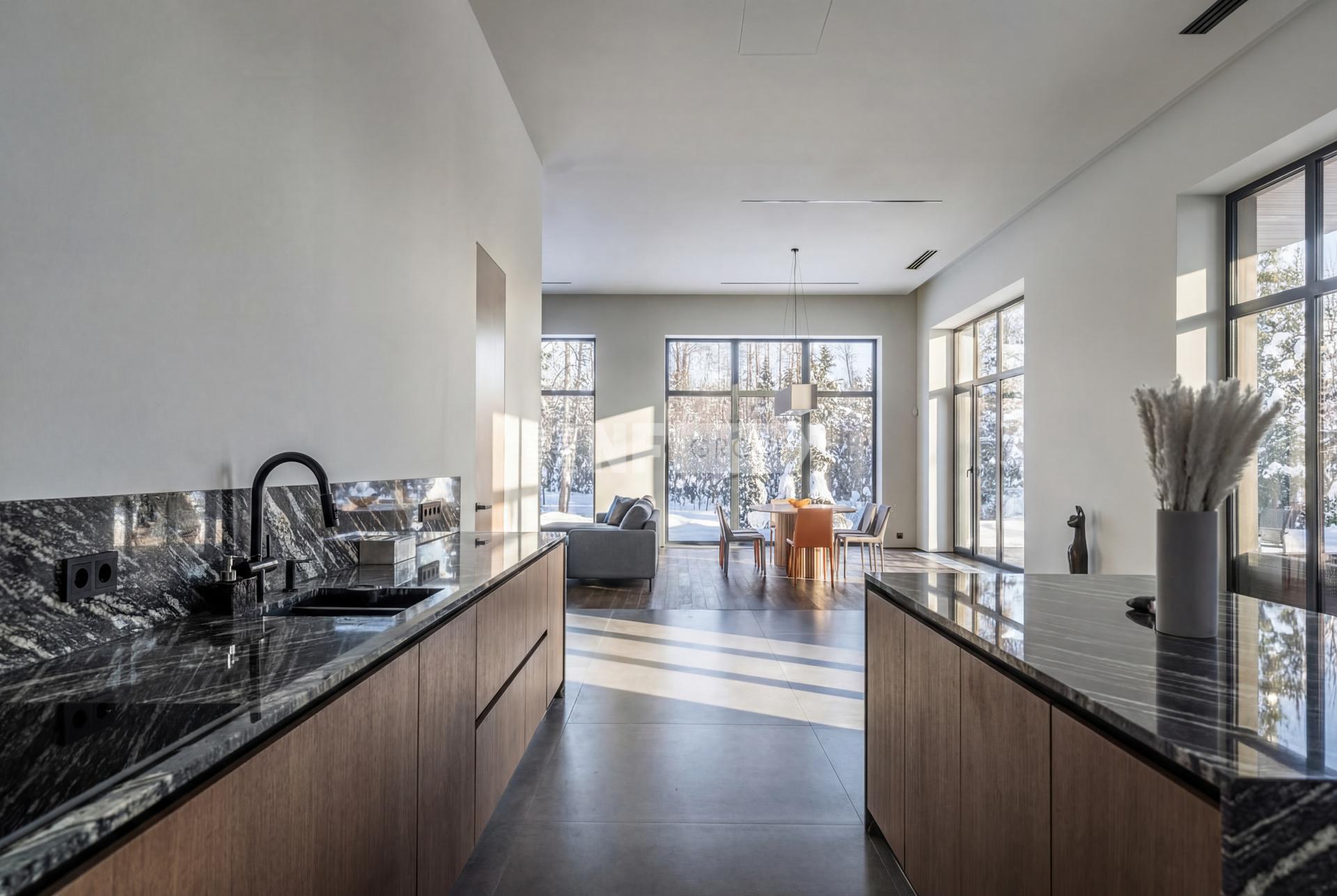 * Просторную гостиную-кухню площадью 100 м² с высокими потолками 4 метра и выходом к подогреваемому бассейну 9×3 метра