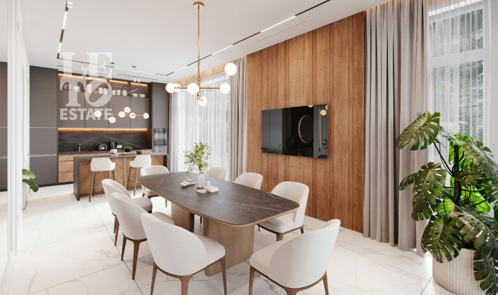 В доме мультифункциональное, панорамное остекление с заполнением аргоном, на уличных террасах напольное покрытие из керамогранита, предусмотрено фасадное освещение.