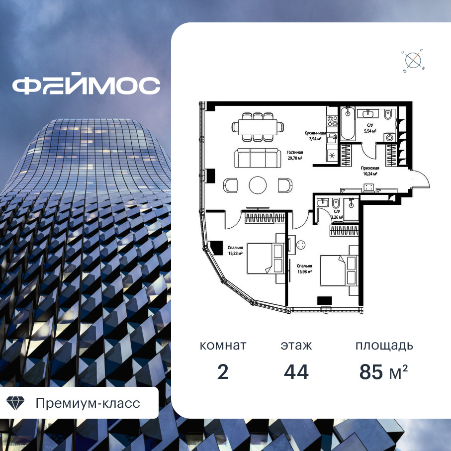 Продаётся 2-к квартира общей площадью 85 кв. м с предчистовой отделкой на 44-м этаже премиального небоскреба Феймос.