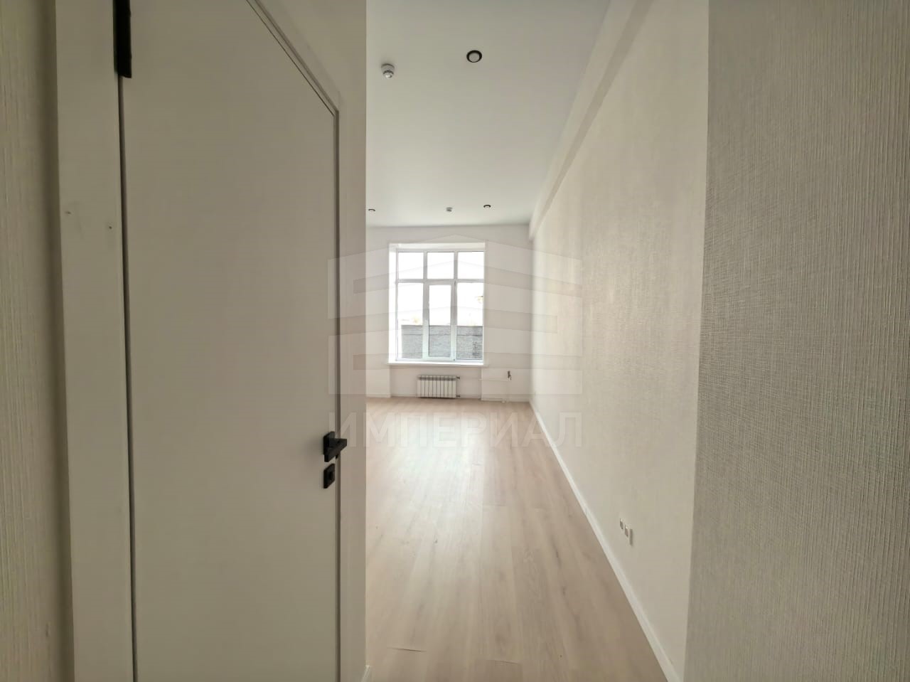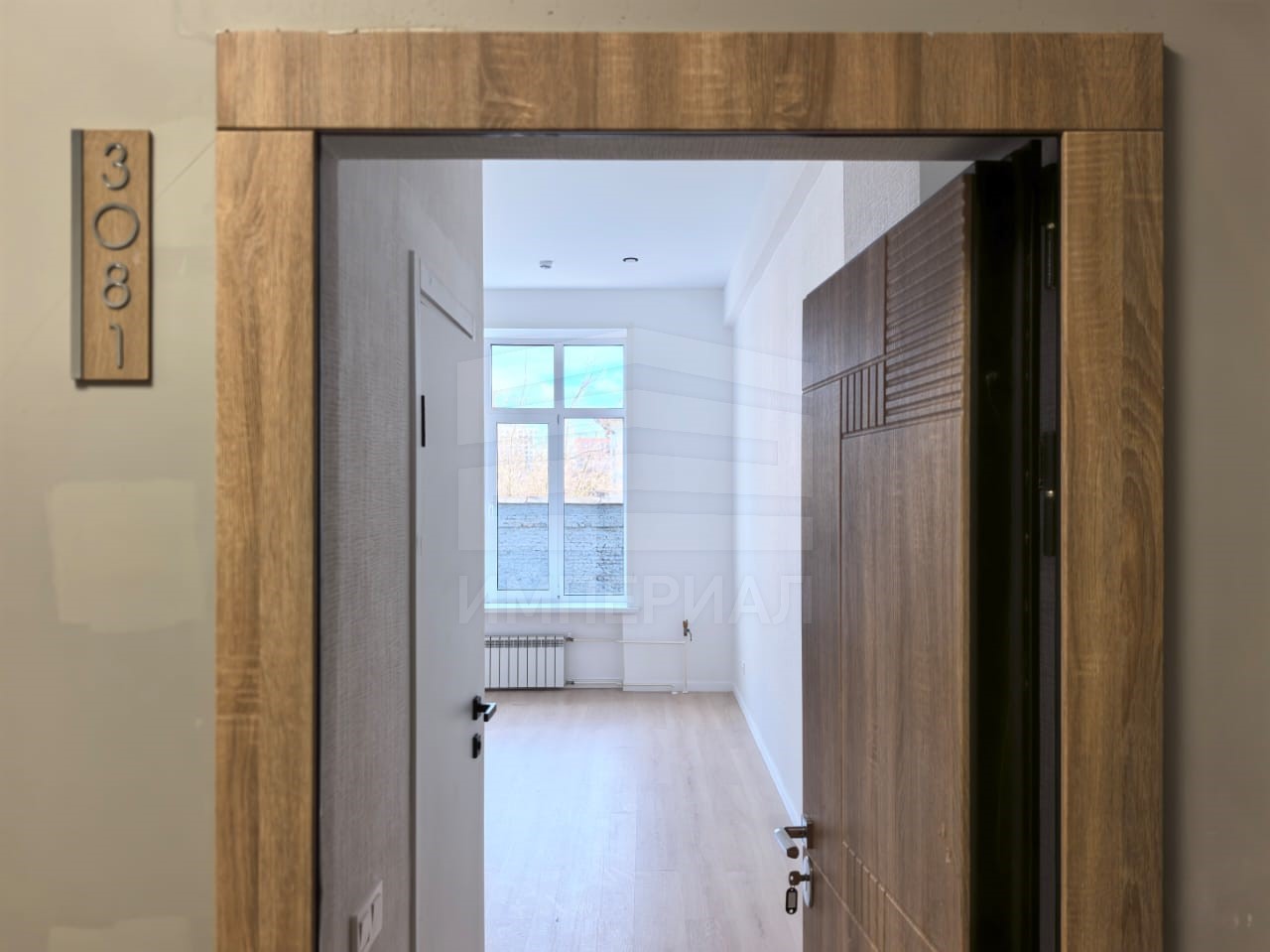 На стенах поклеены обои под покраску, на полу постелен ламинат с плинтусами и откосами. Есть вытяжная вентиляция в санузле и на кухне, выходы хв/гв, место под раковину на кухне. Кроме того, в помещениях уже есть выключатели освещения, розетки для бытовой техники и роутера, а также сделаны закладные для оптоволокна для интернета.