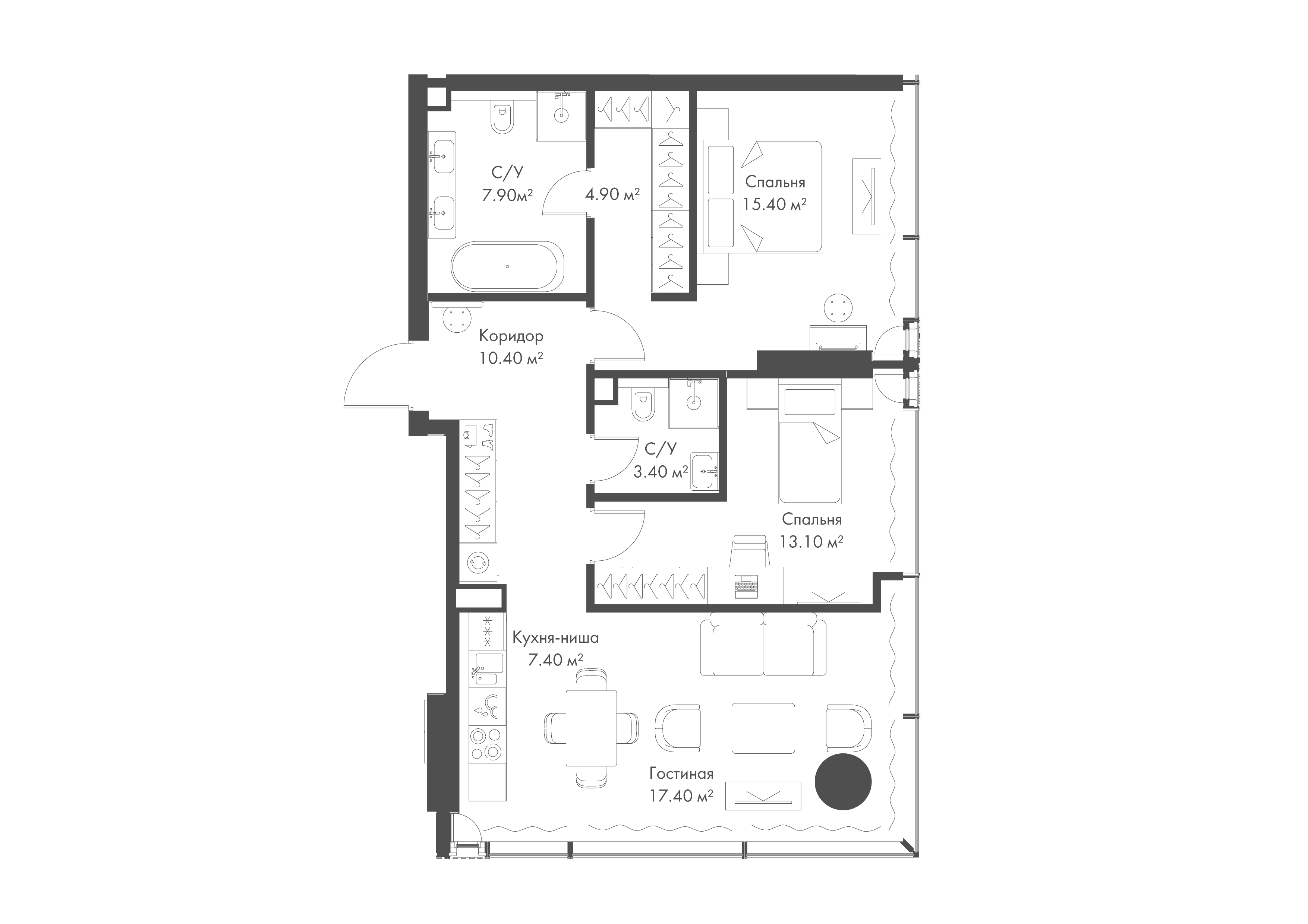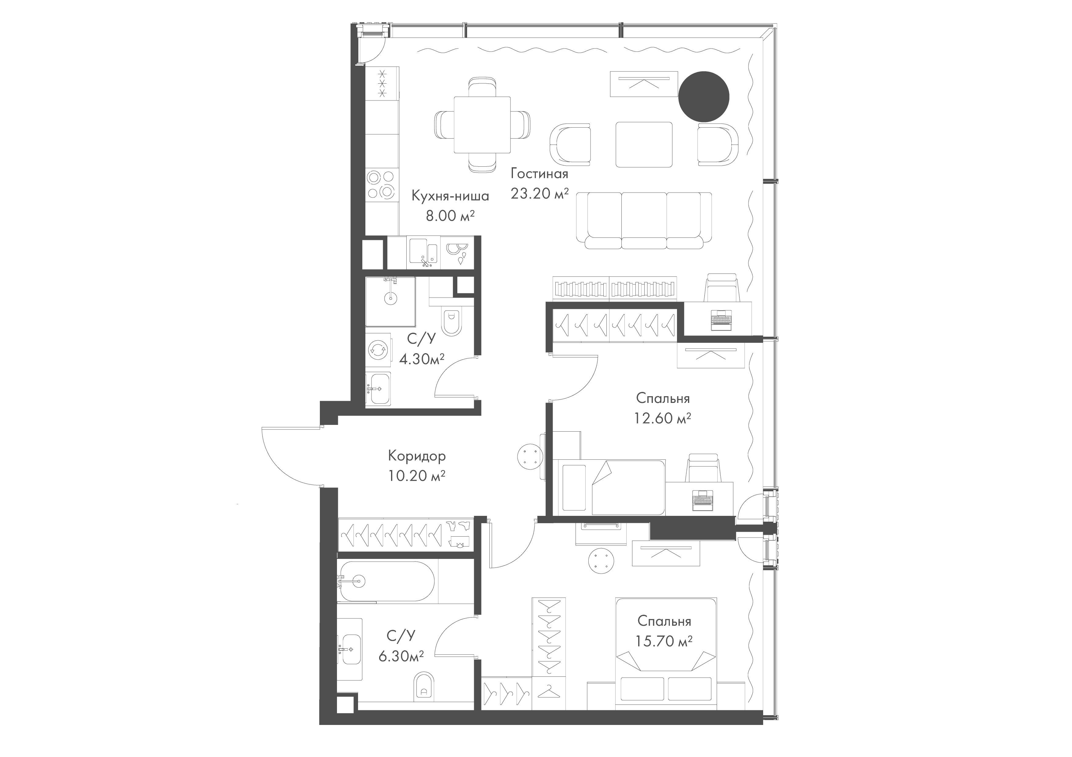 Закруглённая геометрия башен делает виды панорамными и визуально расширяет пространство.