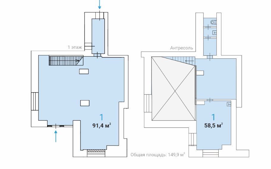 2 уровня: 1-й этаж 34,7 м2, антресоль 1-го этажа 84,3 м2.