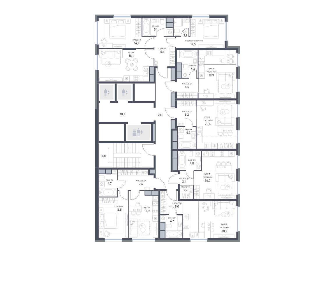 - мастер-спальни с собственными санузлами,