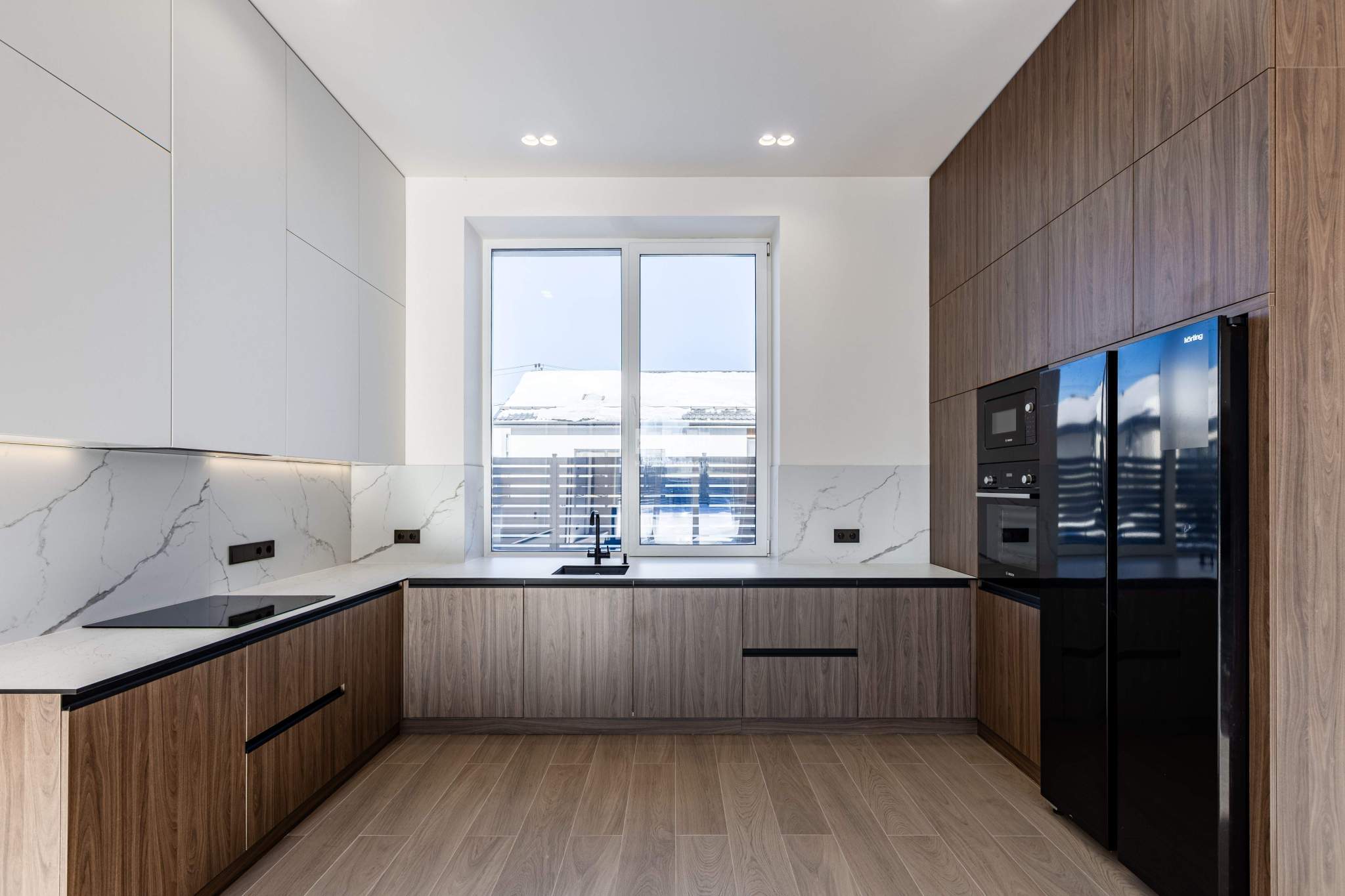 Фасад облицован белоснежной штукатуркой, благородным ригельным кирпичом и высококачественными тёмно-серыми панелями, напоминающими планкен. Большие окна наполняют внутренние пространства солнечным светом и теплом, создавая приятную атмосферу. Лаконичный интерьер гармонично сочетает кремовые оттенки с фактурами камня и дерева.