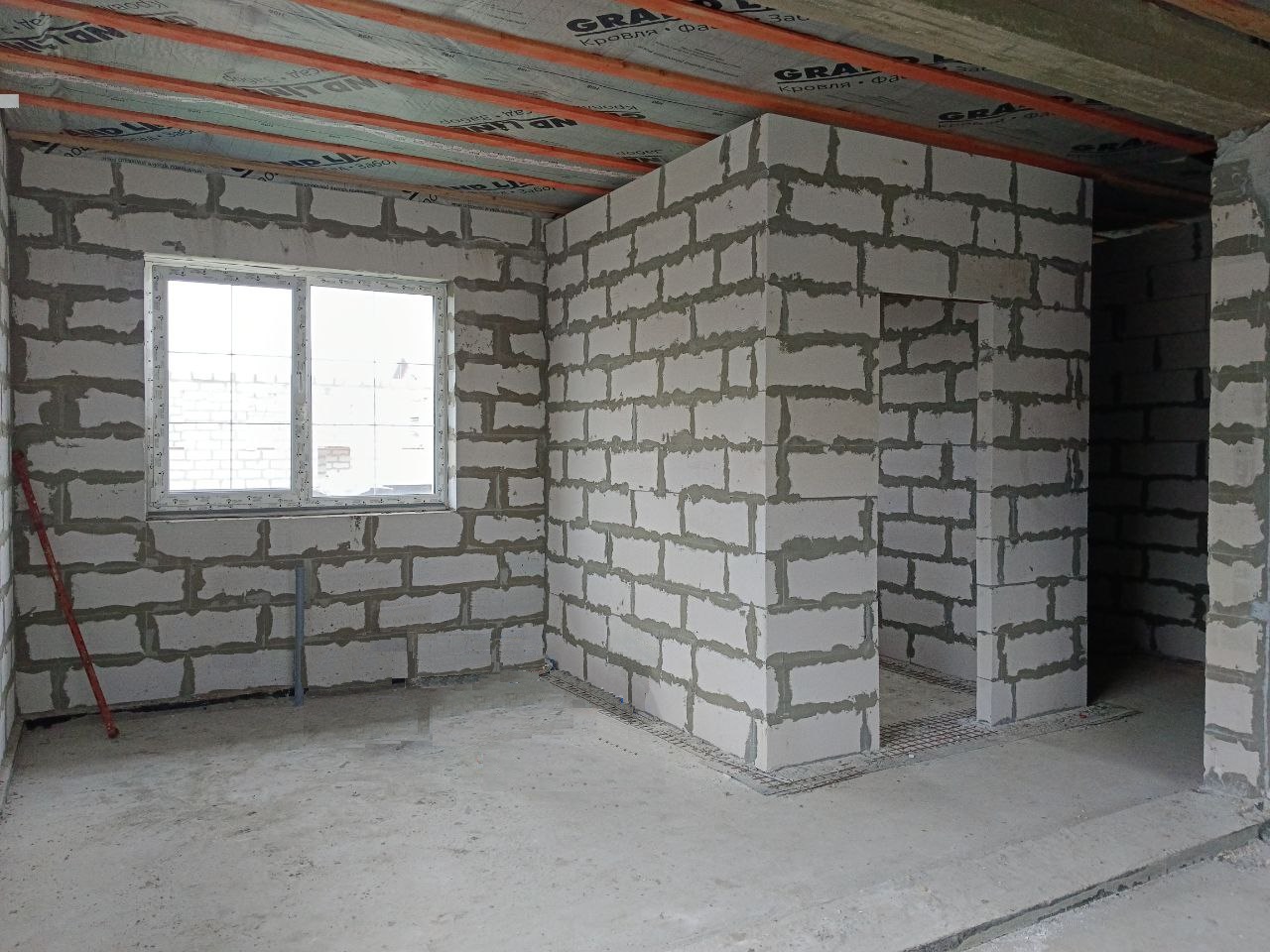 Дом без внутренней отделки. Установлены межкомнатные перегородки. Выполнено утепление перекрытия.