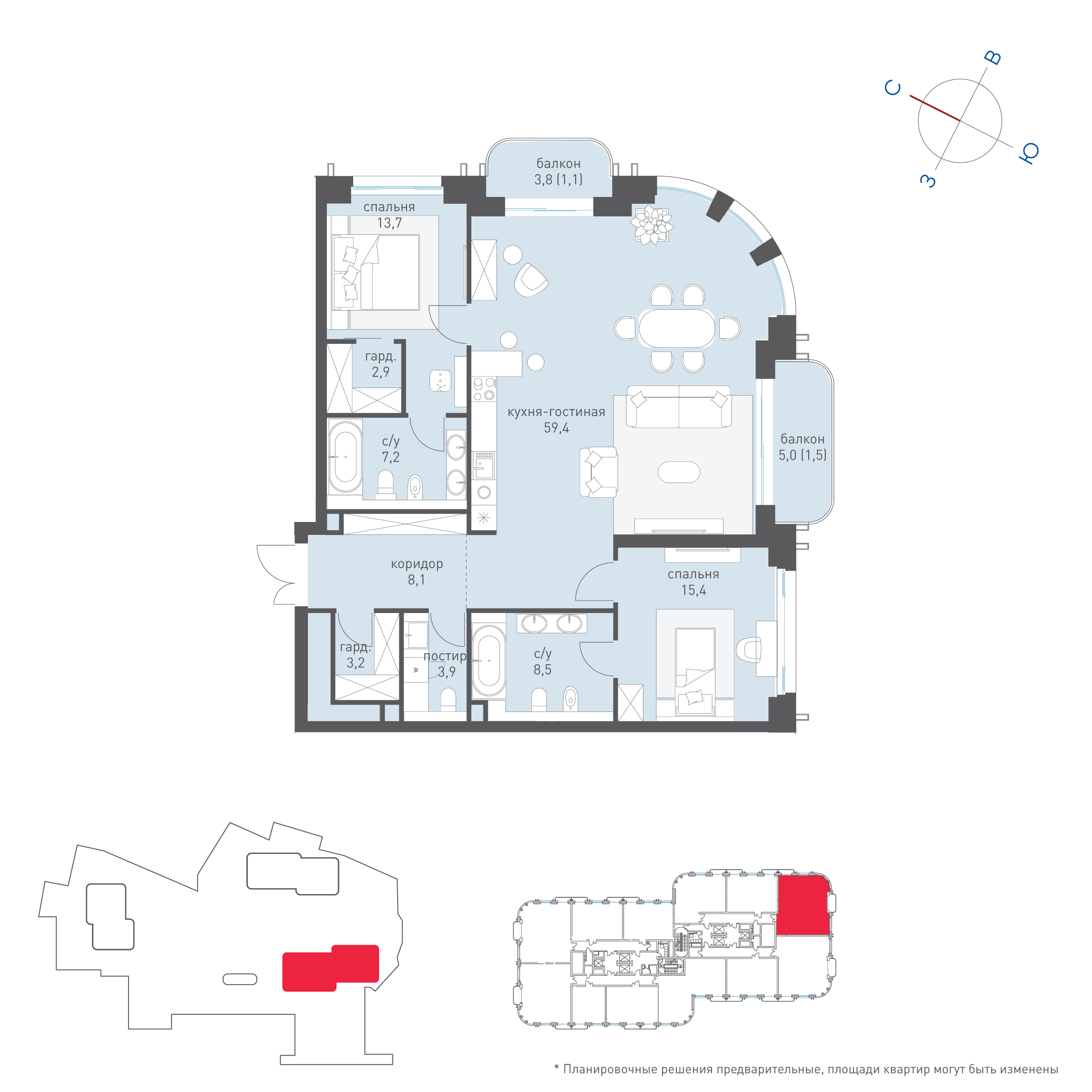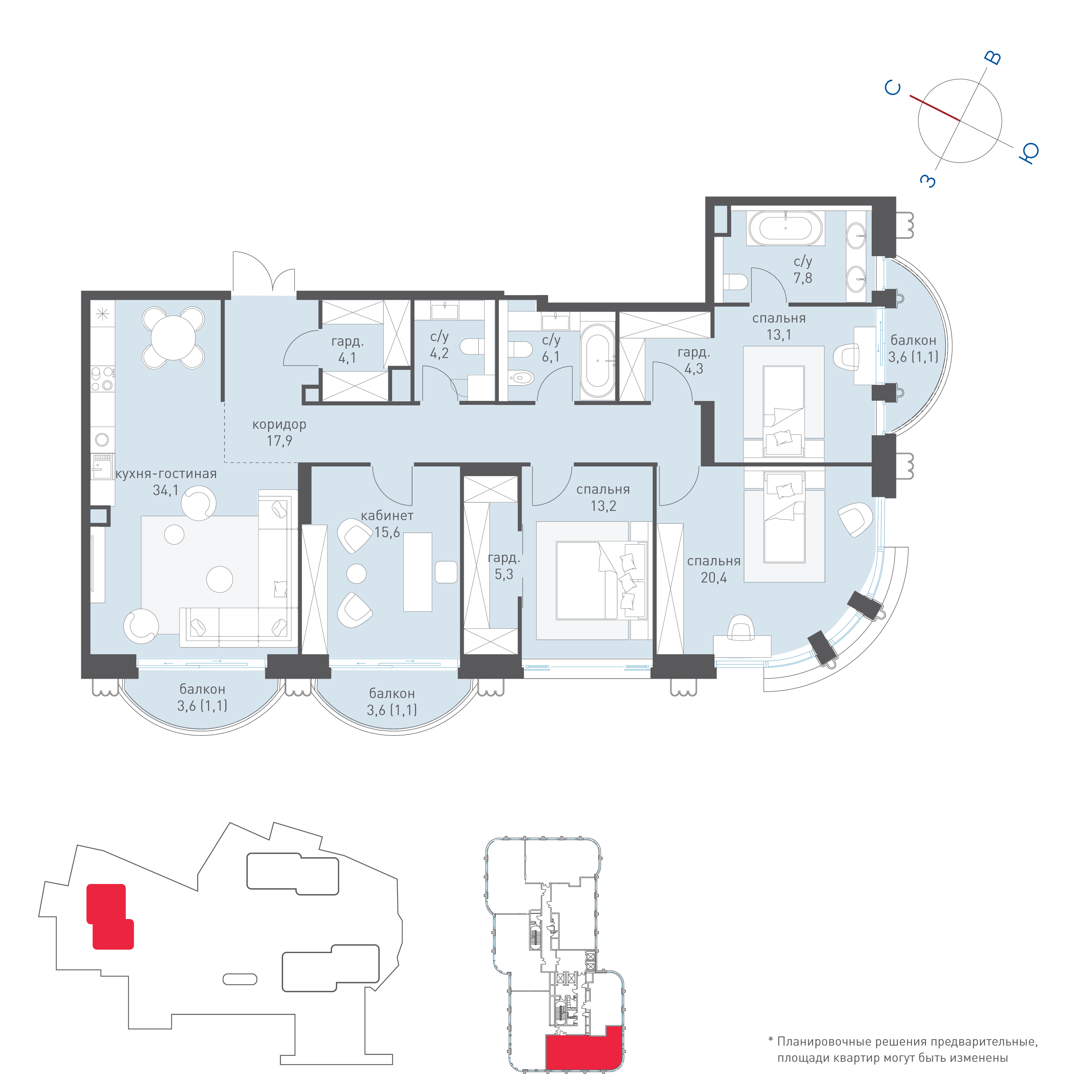 Закруглённая геометрия башен делает виды панорамными и визуально расширяет пространство.