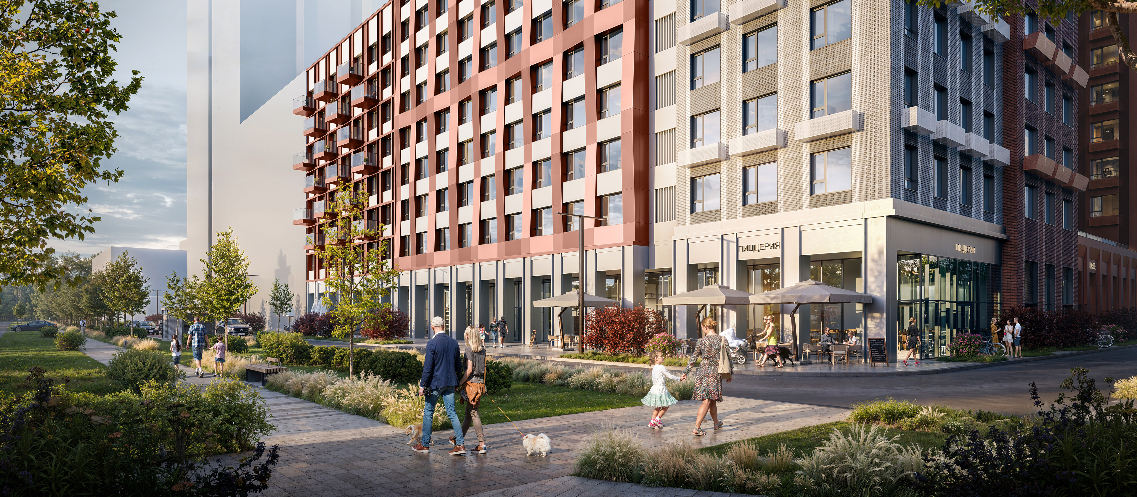 Квартал от архитектурной мастерской М.А.М. органично дополняет городской ландшафт. Разновысотные корпуса в минималистичном стиле сочетают мягкие пластичные линии и строгие геометрические формы. Цветовая гамма фасадов — контраст терракотового и молочно-серого оттенков, которые создают атмосферу тепла и уюта.