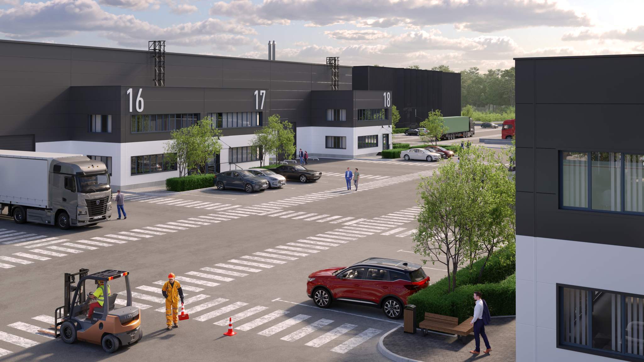 - Парковки для транспорта: для грузовых авто — 2 места, для легкового авто — 4 места