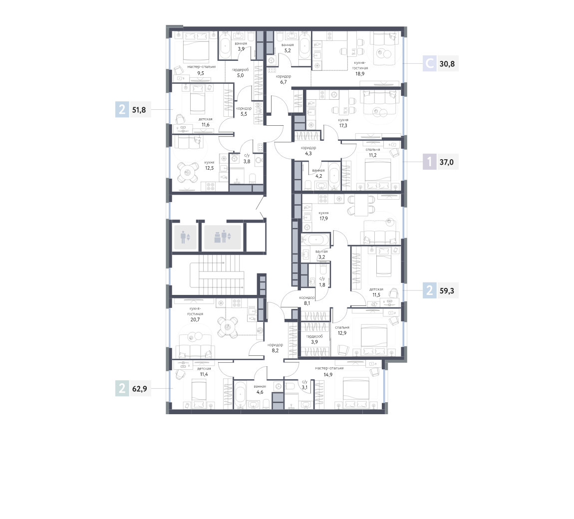 - мастер-спальни с собственными санузлами,