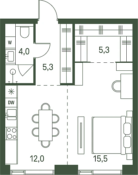 При необходимости в гостиной можно выделить ещё одну изолированную комнату - площадь и количество окон вполне это позволяют.