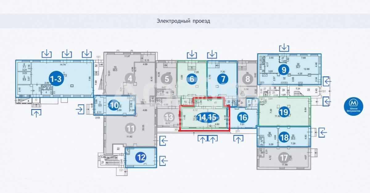 От собственника. Торговое помещение расположено на 1-м этаже административного здания, на 1-й линии Электродного проезда и шоссе Энтузиастов, в 200 метрах от станции метро Шоссе Энтузиастов. Площадь помещения 60,1 м2 (блок 14+15 на плане). В помещении есть 2 отдельных входа. Большие витринные окна, свободная планировка, высокие потолки – 3 м, собственный с/у, выполнен свежий ремонт в стиле лофт. Установлена приточно-вытяжная вентиляция и система центрального отопления. Выделенная мощность 7 кВт. В блоке установлены приборы учета электроэнергии и воды.