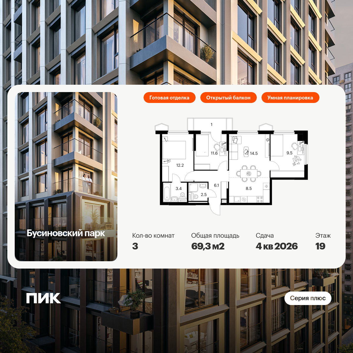 Продаются 3-к апартаменты площадью 64.3 кв.м. на 4-м этаже 28 этажного дома в "ЭМОУШН" от ГК ОСНОВА