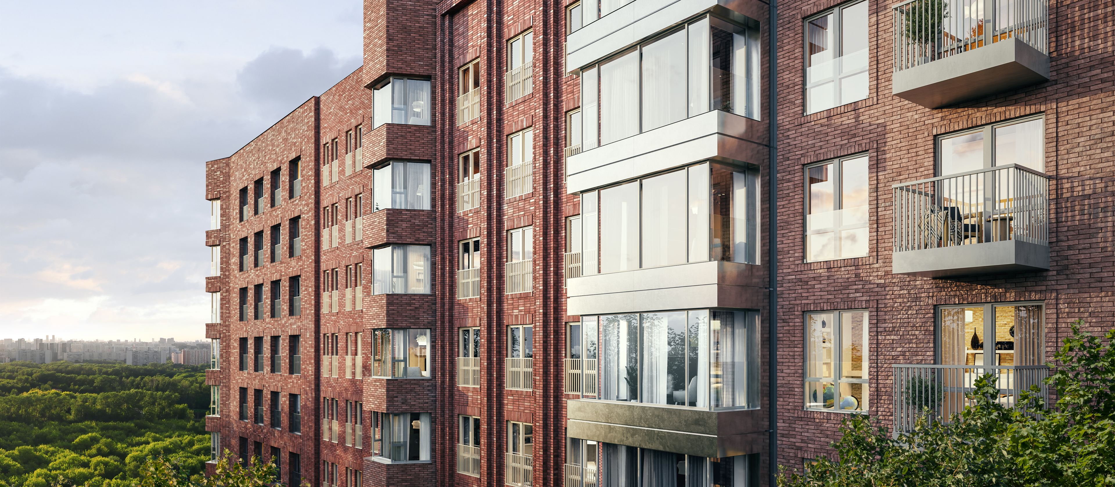 Лобби на первых этажах домов выполнены в стиле современного минимализма: кирпич сочетается с мраморным бесшовным полом из наливного материала терраццо, гладкой плиткой и стеклом. Здесь появятся зоны ожидания, скоростные лифты и помещение для хранения колясок и велосипедов.