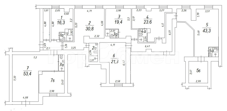 По документу площадь помещения (номер 6 на схеме) 21,3 кв.м Полезная площадь около 15 кв.м - в углу комнаты трубы (при желании можно отгородить стеной, конечно, оставив к ним доступ).