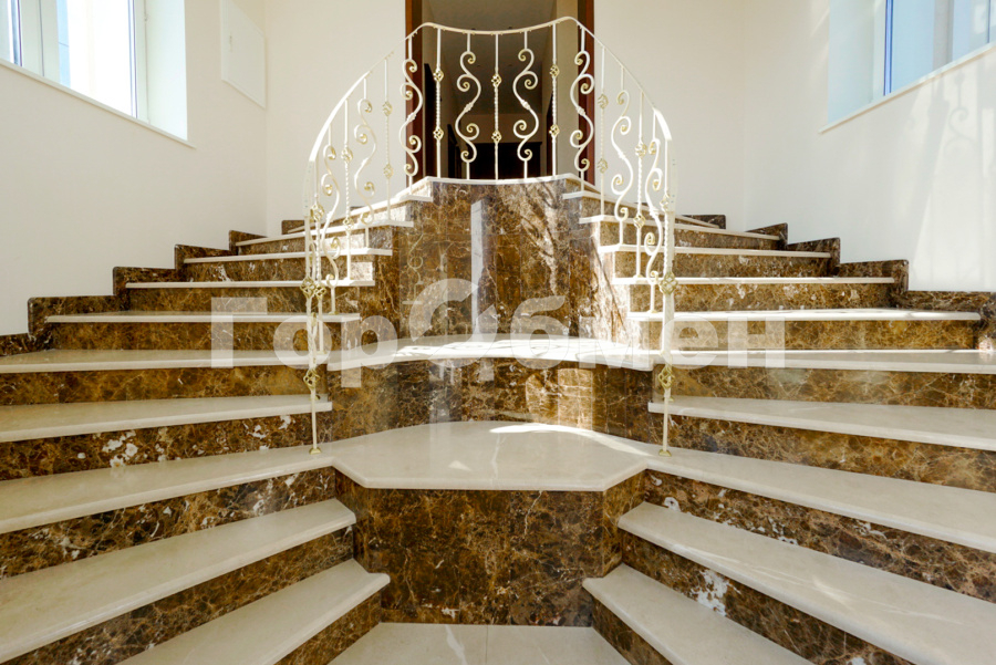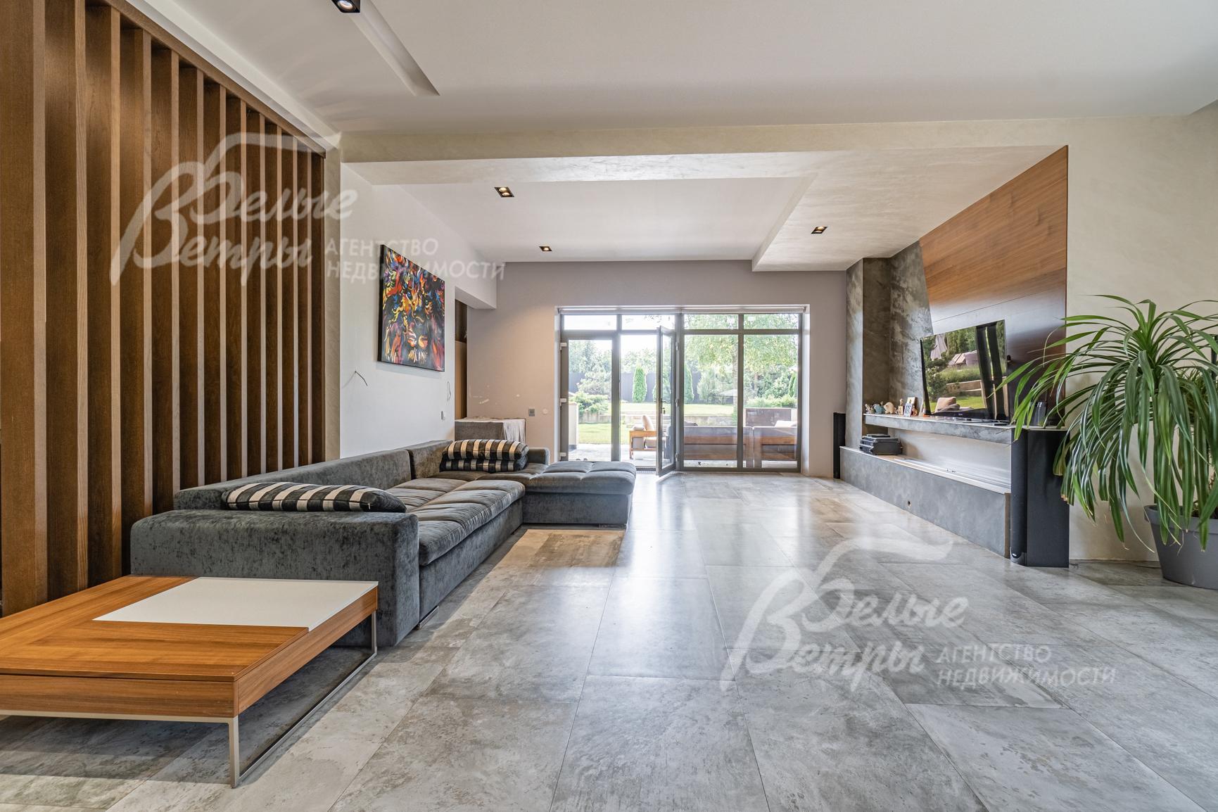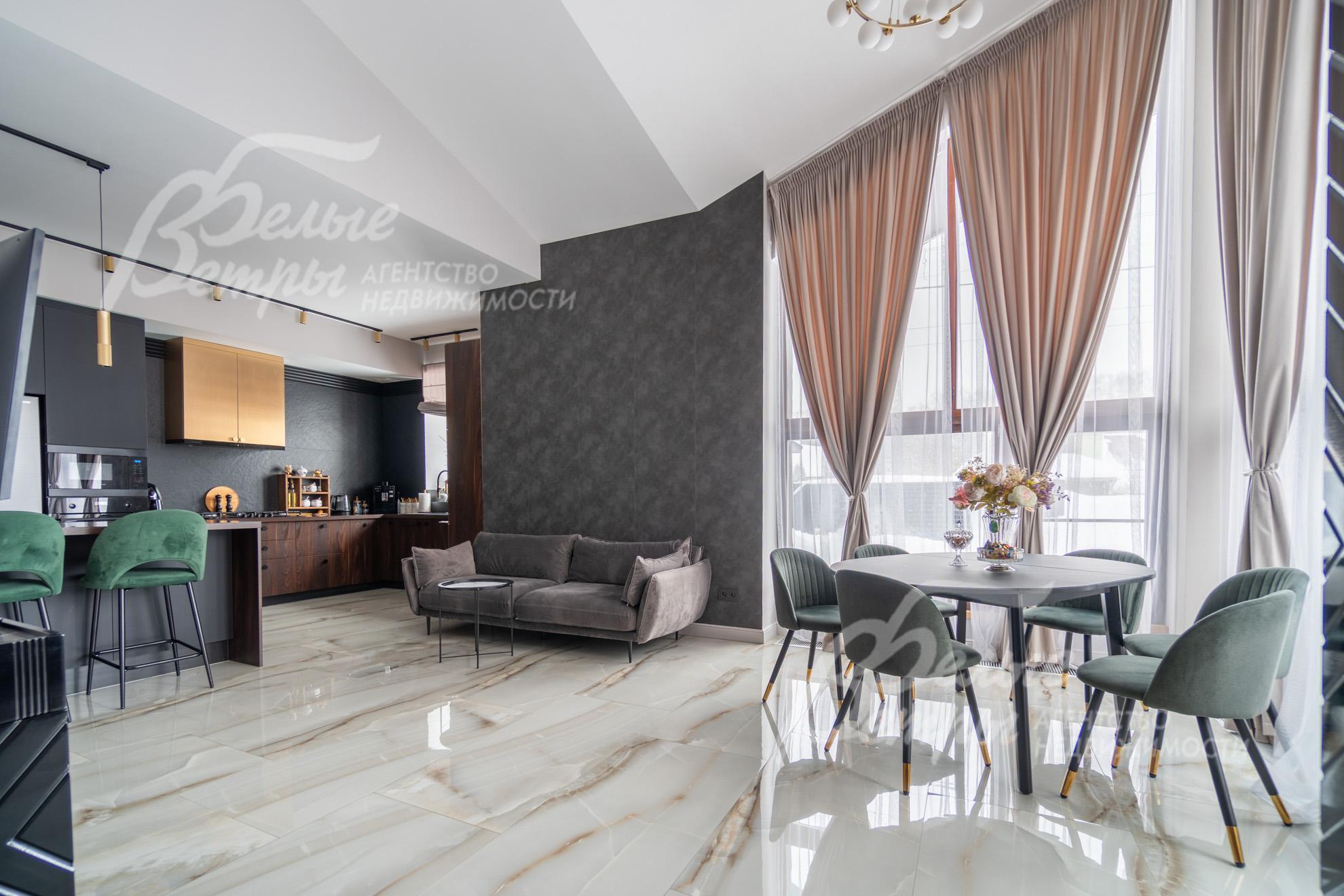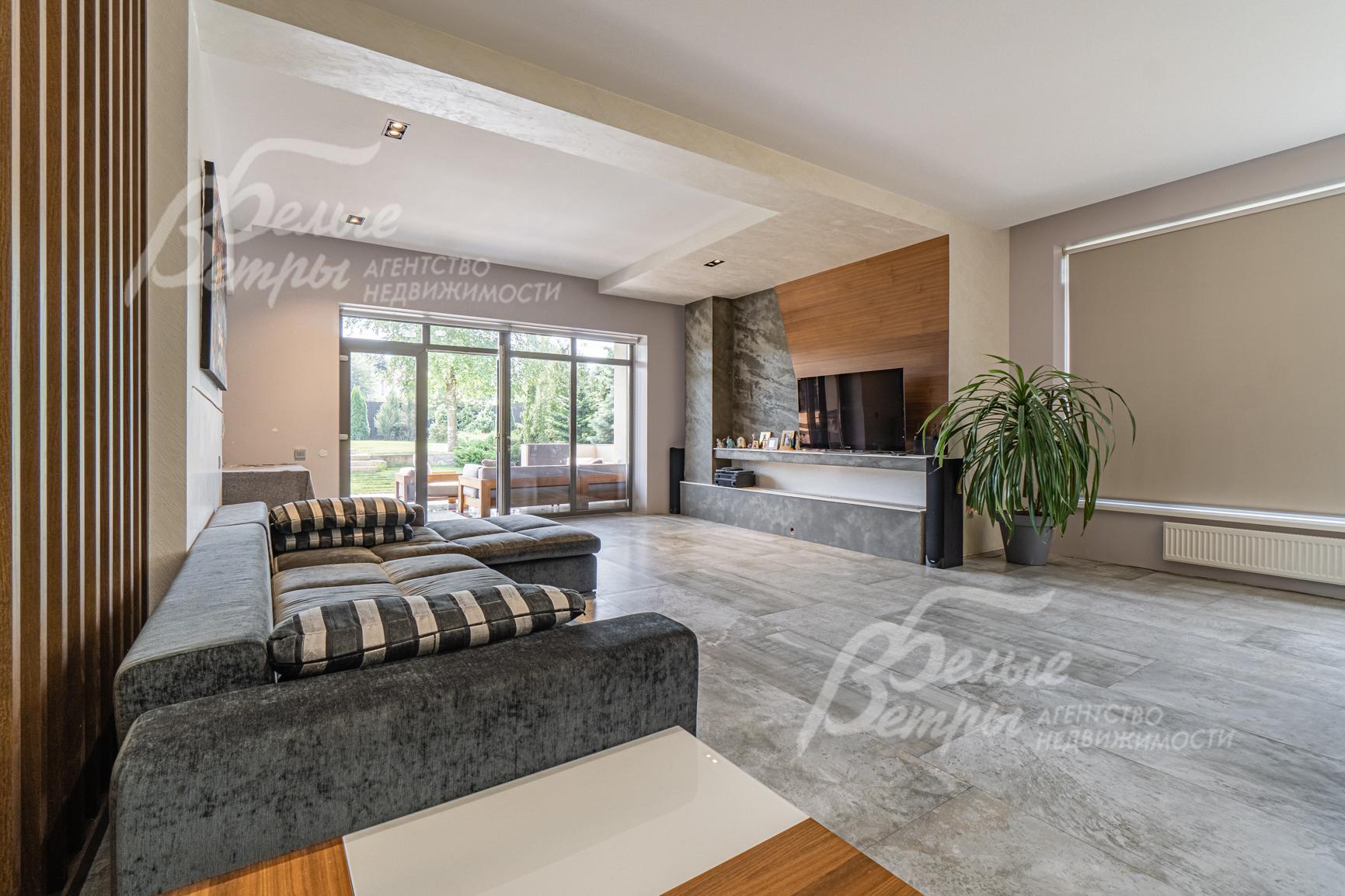 Внутренняя отделка: качественная современная отделка дома выполнена в стиле эклектики с элементами ар-деко и лофта. Стены – обои, в отдельных зонах — частично на кухне, на лестничном проёме и в спальнях — немецкие обои с имитацией штукатурки, в детских спальнях стены оформлены под кирпич, в мастер-спальне и санузле на первом этаже стены украшены фресками Affresco (в санузле - со специальной влагозащитной эмалью). Стена в гостиной за телевизором - из гипсовых панелей. Холл и гостиная дополнены декоративными рейками из ясеня, перекликающимися с дизайном лестницы, а также 3D-панелями ORAC DECOR с рейками из ясеня. Создан декоративный портал, имитирующий камин. На полу кухни уложен керамогранит Laparet Stubay Onyx Crema имитирующий оникс, в гостиной и спальнях — ламинат, во всех санузлах — керамогранит Atlas Concorde. Потолки выполнены из гипсокартона, в отдельных зонах – многоуровневые конструкции. Тёплые полы смонтированы везде, где есть плиточное покрытие. Установлены внутрипольные конвекторы Askon в гостиной, на кухне и в мастер-спальне, а также вертикальные радиаторы чёрного матового цвета Irsap (Италия). Электромонтаж выполнен с особым вниманием к удобству: количество розеток превышает стандартные требования, розетки и выключатели – чёрные, матовые, плоские. Интерьер дополняют межкомнатные двери из массива лиственницы, вандалоустойчивая двустворчатая дверь в кухню со стеклом при входе на кухню, также есть двери скрытого монтажа Инвизибл. Мощная входная дверь с терморазрывом. На второй этаж ведёт широкая и удобная монолитная лестница, отделанная массивом ясеня.