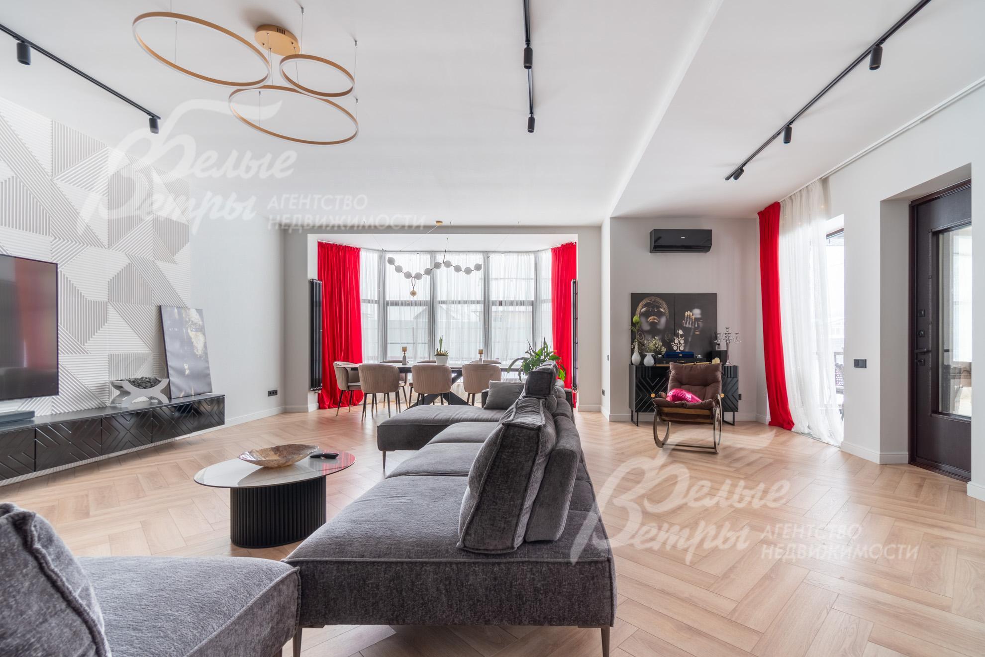 В гостиной – обеденная группа на 10-12 персон: элегантный стол с керамической столешницей, велюровые стулья, телевизор LG 85 дюймов с консолью под ТВ в стиле ар-деко, сделанной на заказ. В центре – огромный модульный диван-трансформер с обивкой из ткани букле. Интерьер гостиной дополнен дизайнерским стеллажом (Гарда Декор) в стиле ар-деко с гальваническим покрытием золотого цвета и полками из закаленного стекла, круглым зеркалом с консолью, комодами тёмного цвета, люстрой из латуни «Бусы Коко Шанель». Дополнительно выполнено трековое освещение. В постирочной – стиральная и сушильная машины AEG, гладильные принадлежности, модульные шкафы для хранения. В гардеробной на первом этаже – система хранения (ИКЕА). Все спальни полностью укомплектованы дорогостоящей мебелью: кроватями, прикроватными тумбами, комодами, телевизорами LG, шкафами, рабочими зонами. На мансардном этаже – модульный диван, обшитый антивандальным покрытием, и телевизор SONY. Шторы сшиты на заказ. В санузлах – водяные полотенцесушители Grocenberg, унитазы NOVA, гигиенический душ (в каждом санузле), оборудованы душевые, на первом этаже - смесители Boheme, на втором этаже - ванна и чёрная матовая фурнитура GRONENBERG и TECE.