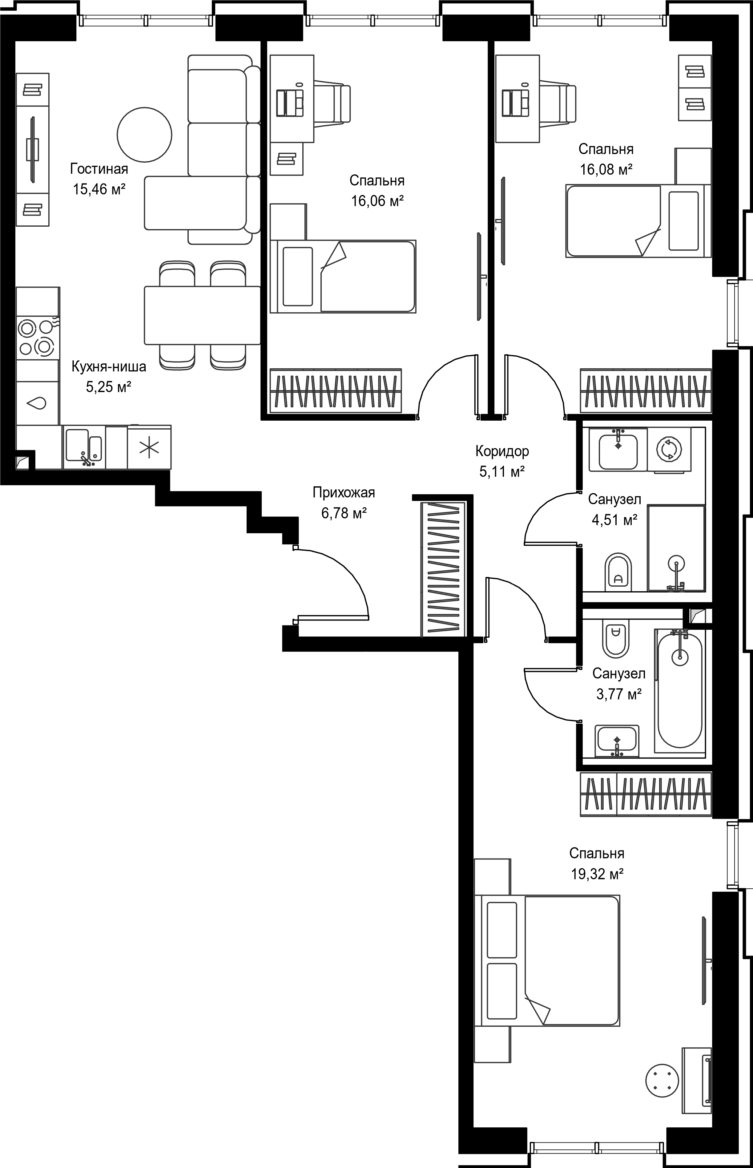 Без отделки. Есть варианты квартир с дизайнерской отделкой и с предчистовой отделкой white box в других корпусах ЖК.