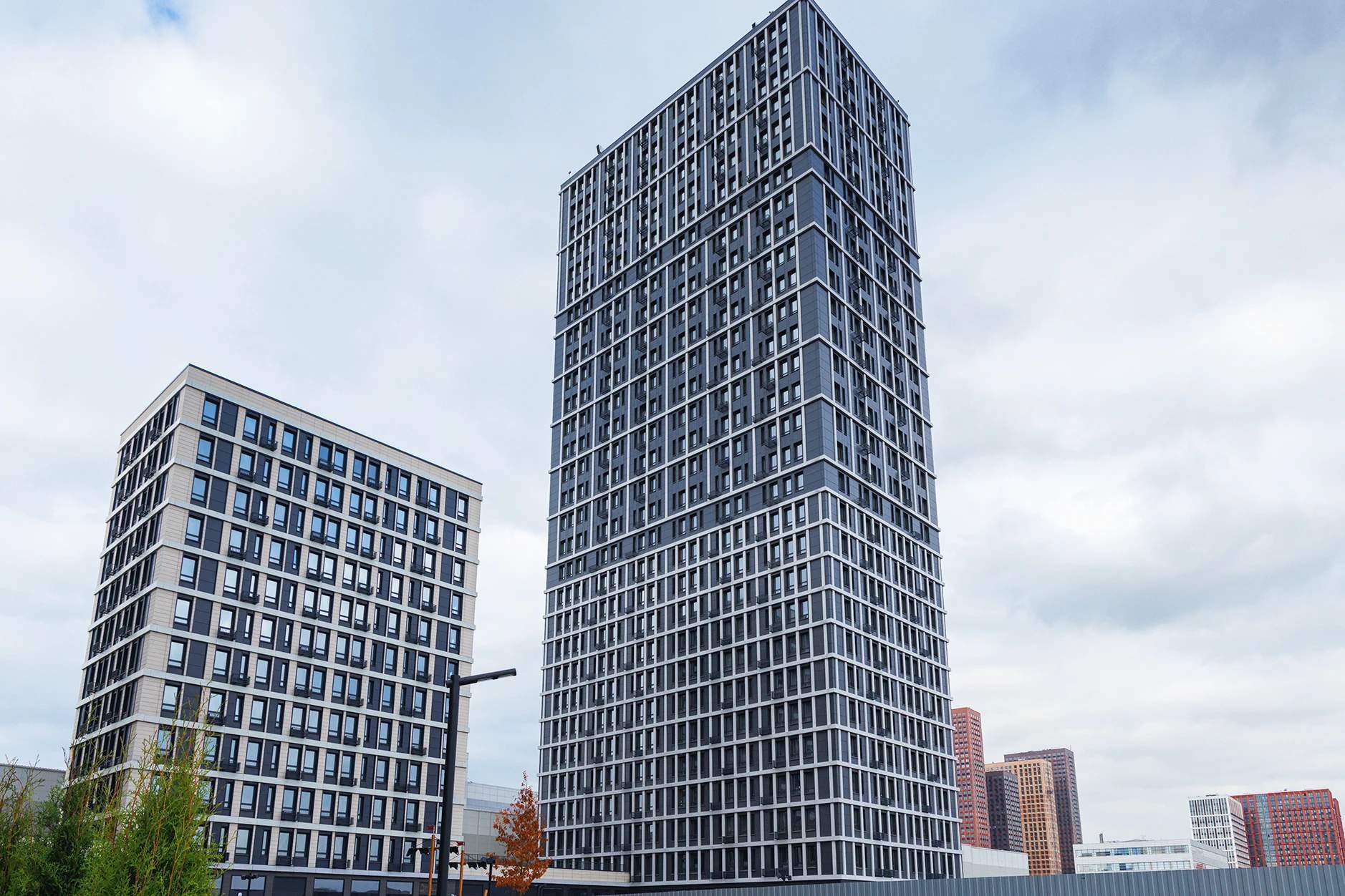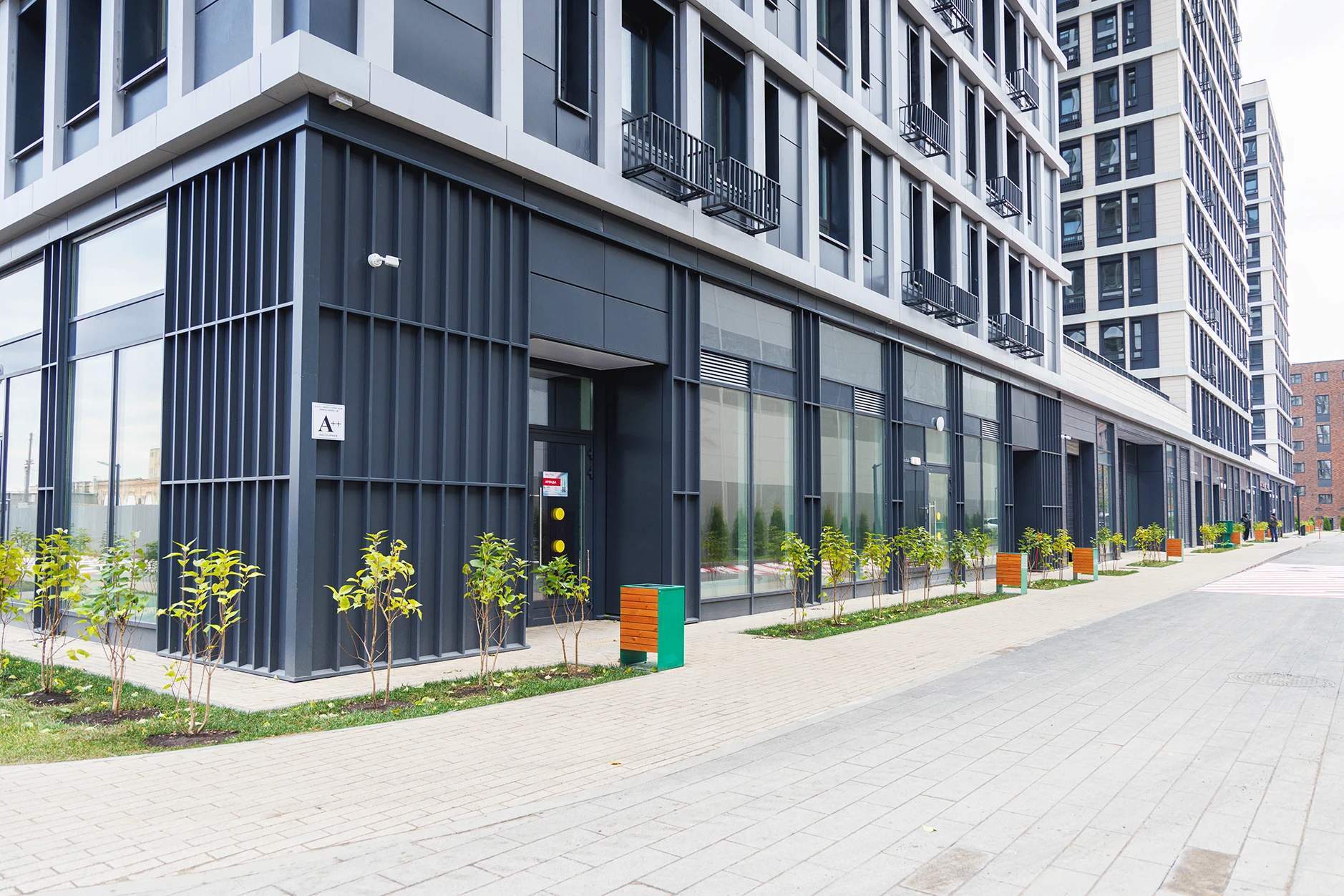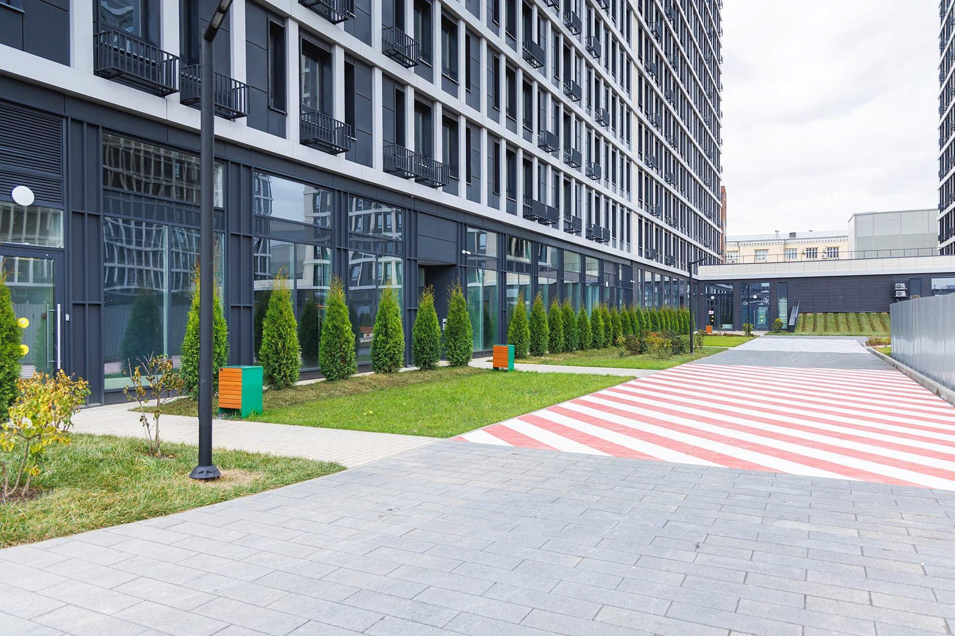 Современная архитектура от T+T Architects с металлическими фасадами, панорамным остеклением и закрытыми дворами (детские площадки playhub, спортзоны) . Комплекс сочетает урбанистику и комфорт - идеально для бизнеса с потоком жителей и посетителей.