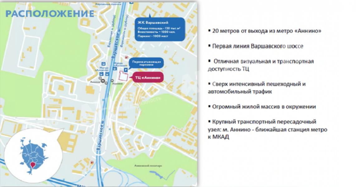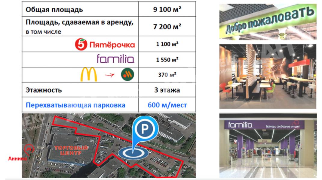 Лот №1050645 Продажа ГАБ 9072.9 м2 здание ТЦ Аннино у выхода из м.Аннино (менее 20 секунд пешком по потоку). Первая проходная и проездная линия Варшавского шоссе. Огромный жилой массив в окружении (в зоне 10 мин пешей доступности проживает 50 000 человек). В ТЦ Пятерочка, Фамилия, Вкусно и точка, другие арендаторы. Зальная планировка. Цоколь и 2 этажа. Все центральные коммуникации. Пpиточно-вытяжнaя вентиляция, кoндиционировaниe, мокpыe точки. Обopудoвaно пoдъeмником гpузoподъемностью 2,5т. Есть подъезд для разгрузки. Эскалаторы с двусторонним направлением. Наличие перехватывающей парковки (600 машиномест) Потолок 3.3м. Профиль - по запросу. Реклама на фасаде. МАП 16.5млнр. Окупаемость 8 лет. Продажа по ДКП. Земельный участок, аренда до 16.01.2050г.