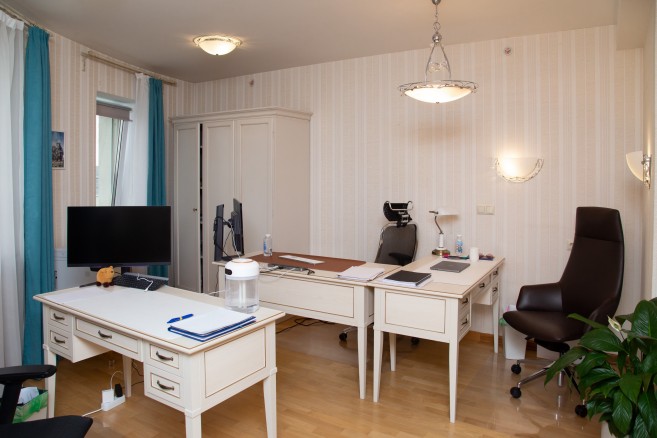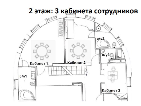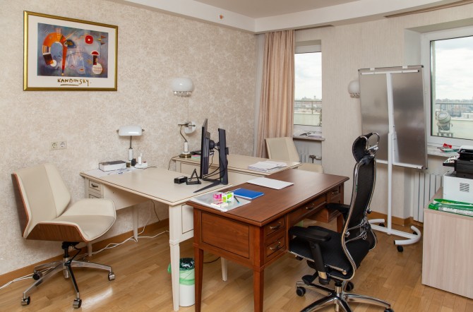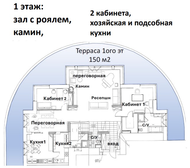Функциональная планировка - ресепшен, отдельные кабинеты руководителей, конференц-зал, 5+ кабинетов, гостиная, 2 кухни, сан.узлы, зона отдыха, гардероб.