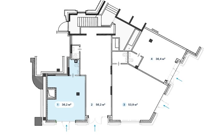 Отдельный вход в помещение с фасада дома. Высота потолков - 4 м. Железобетонные перекрытия. Помещения подготовлены под чистовую отделку. Новые большие витрины.