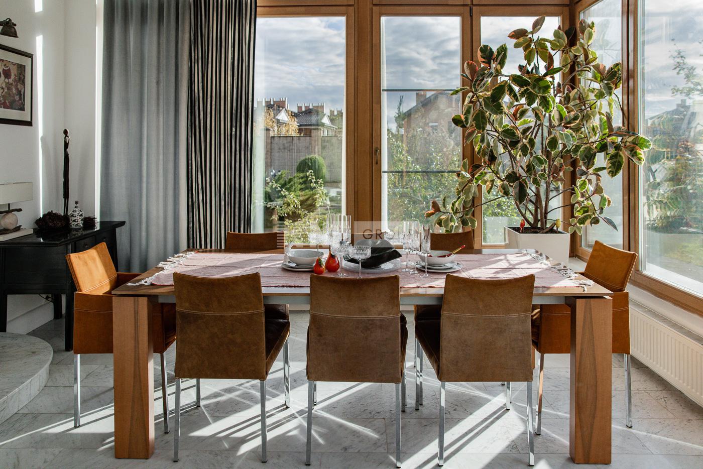 Дом расположен в элитном коттеджном поселке «Монолит». Архитектура особняка выполнена в неоклассическом стиле, внутренний дизайн оформлен в стиле модерн. В декоре использованы исключительно дорогостоящие материалы: ценные породы дерева, мрамор Carrara Bianco, лепнина ручной работы.