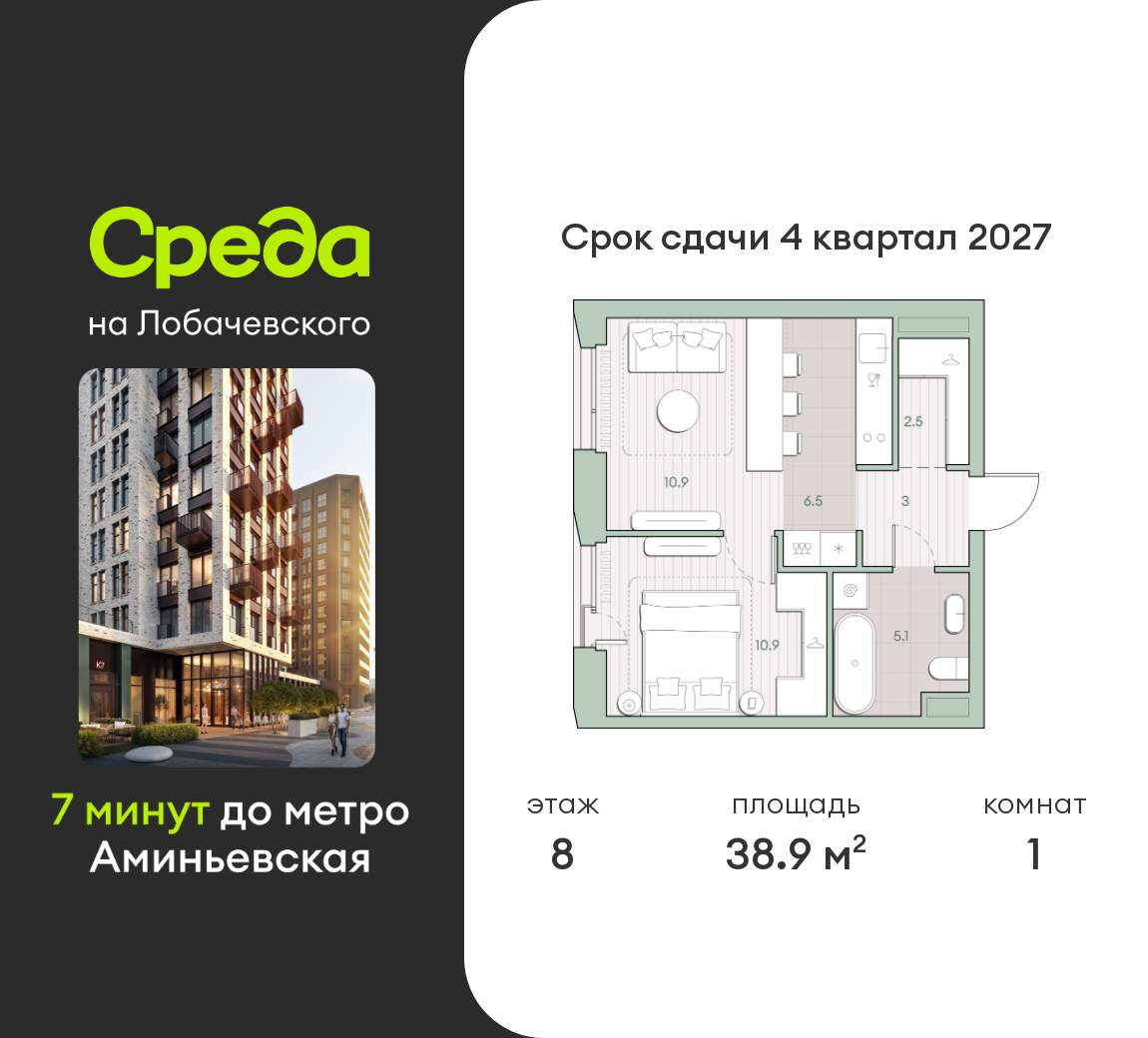 Квартира располагается на 8 этаже 27-этажного дома в ЖК Среда на Лобачевского.