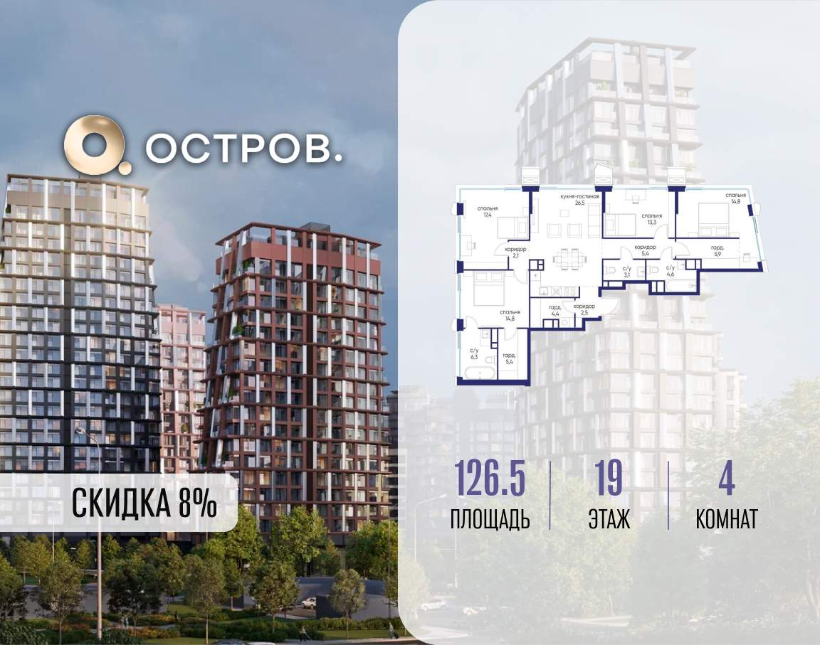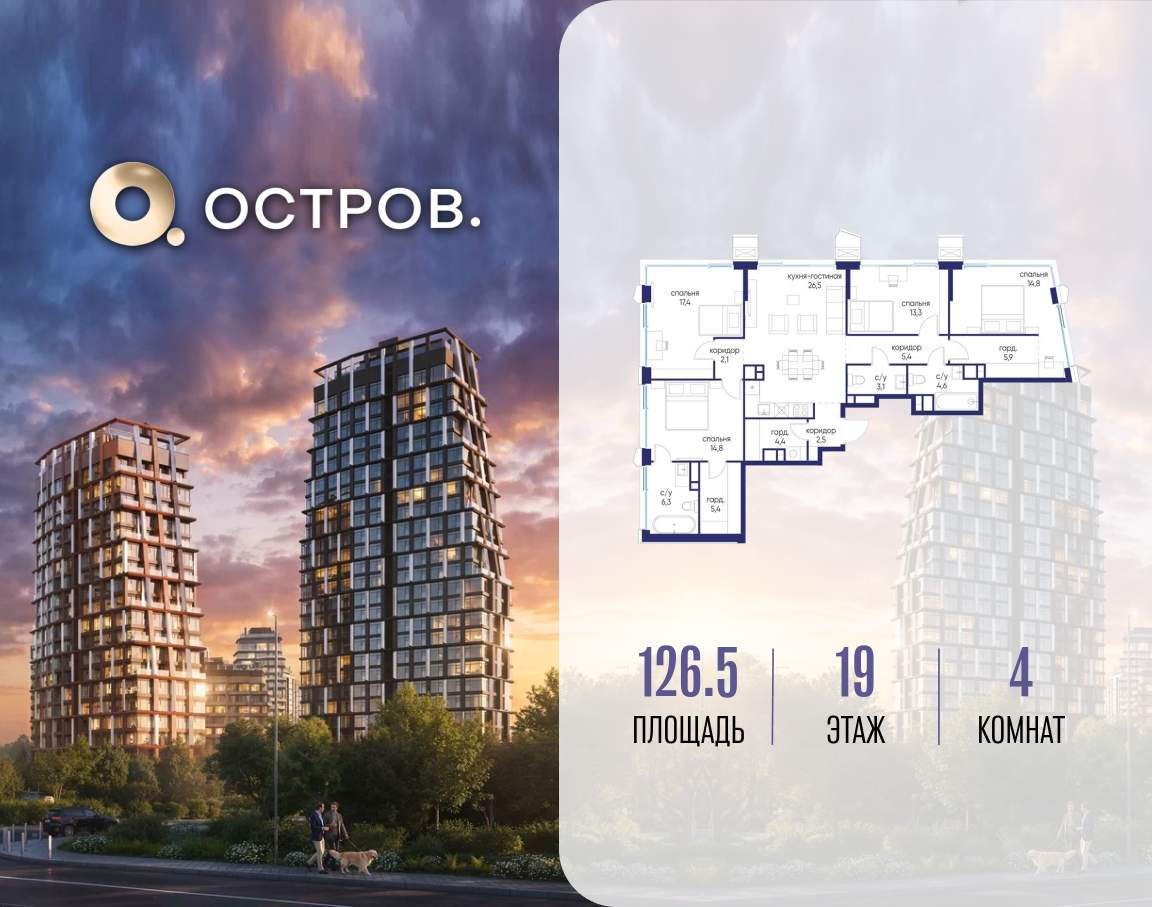 Продаётся 4-комн. квартира от застройщика: общая площадь 126.50 м, жилая 60.30 м, кухня 26.50 м, 19-й этаж, жилой квартал «Остров 14», корпус 6 (секция 1) . Срок сдачи: 2 квартал 2029 года.
