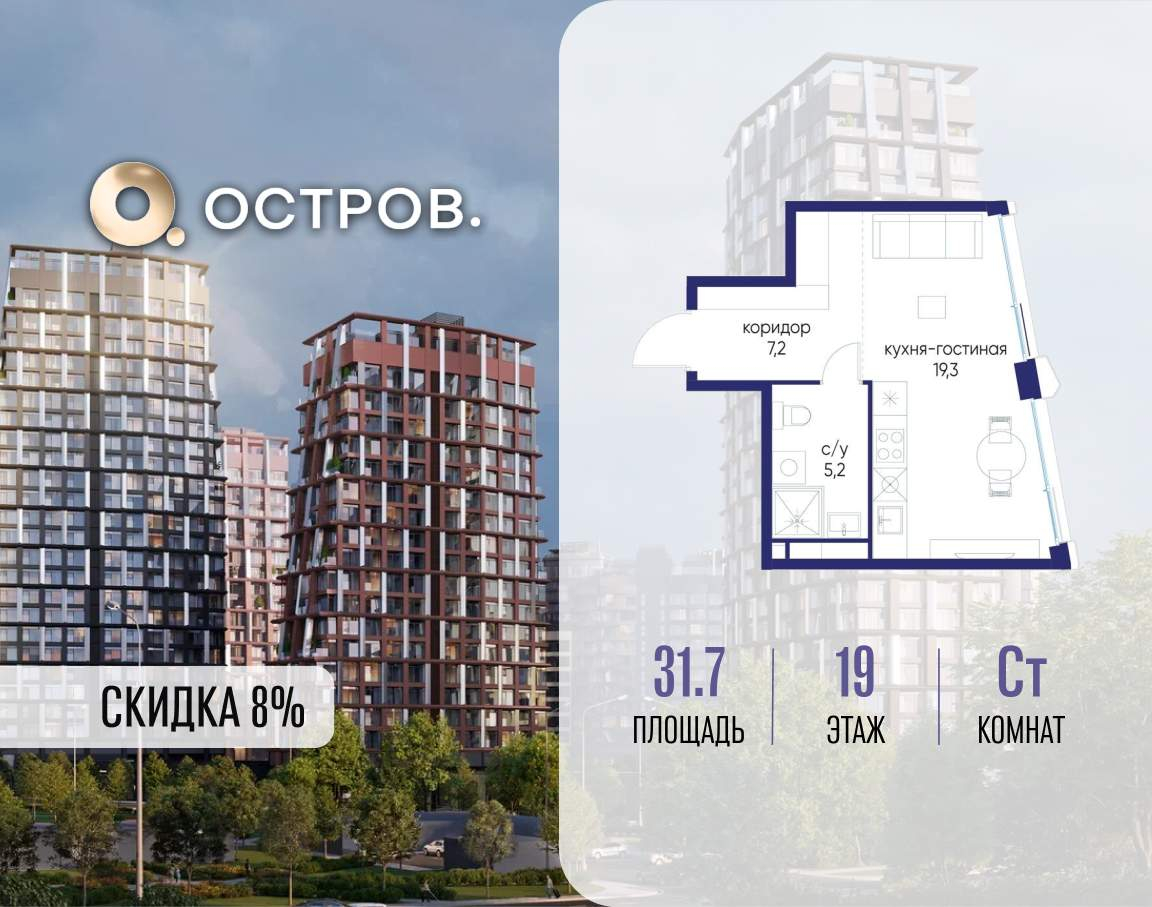 Продаётся квартира от застройщика: общая площадь 31.70 м, жилая 14.30 м, кухня 5.00 м, 19-й этаж, жилой квартал «Остров 14», корпус 6 (секция 1) . Срок сдачи: 2 квартал 2029 года.