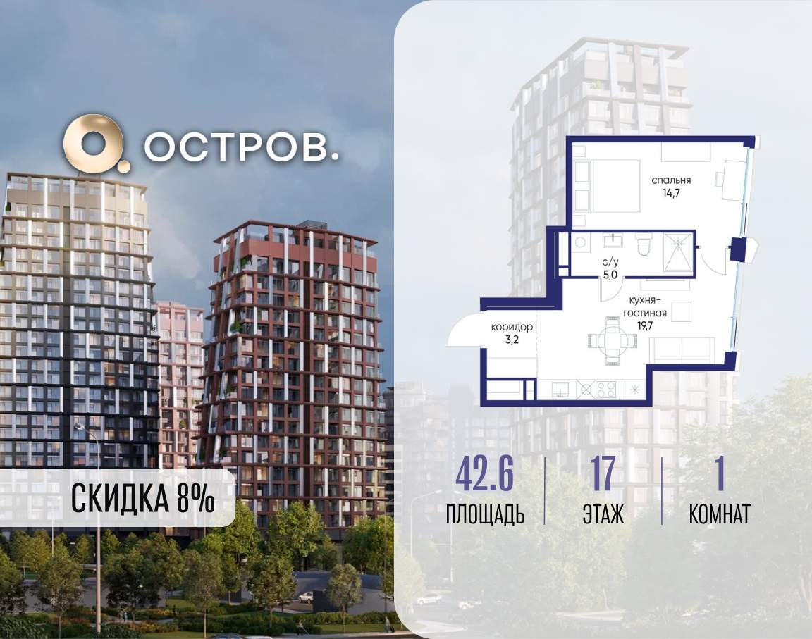 Продаётся 1-комн. квартира от застройщика: общая площадь 42.60 м, жилая 14.70 м, кухня 19.70 м, 17-й этаж, жилой квартал «Остров 14», корпус 6 (секция 1) . Срок сдачи: 2 квартал 2029 года.