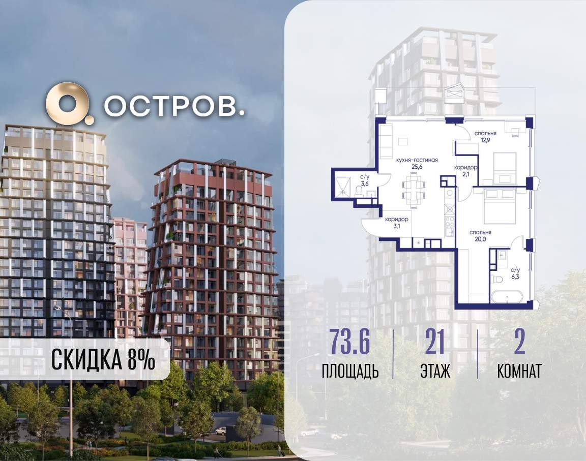 Продаётся 2-комн. квартира от застройщика: общая площадь 73.60 м, жилая 32.90 м, кухня 25.60 м, 21-й этаж, жилой квартал «Остров 14», корпус 4 (секция 1) . Срок сдачи: 2 квартал 2029 года.