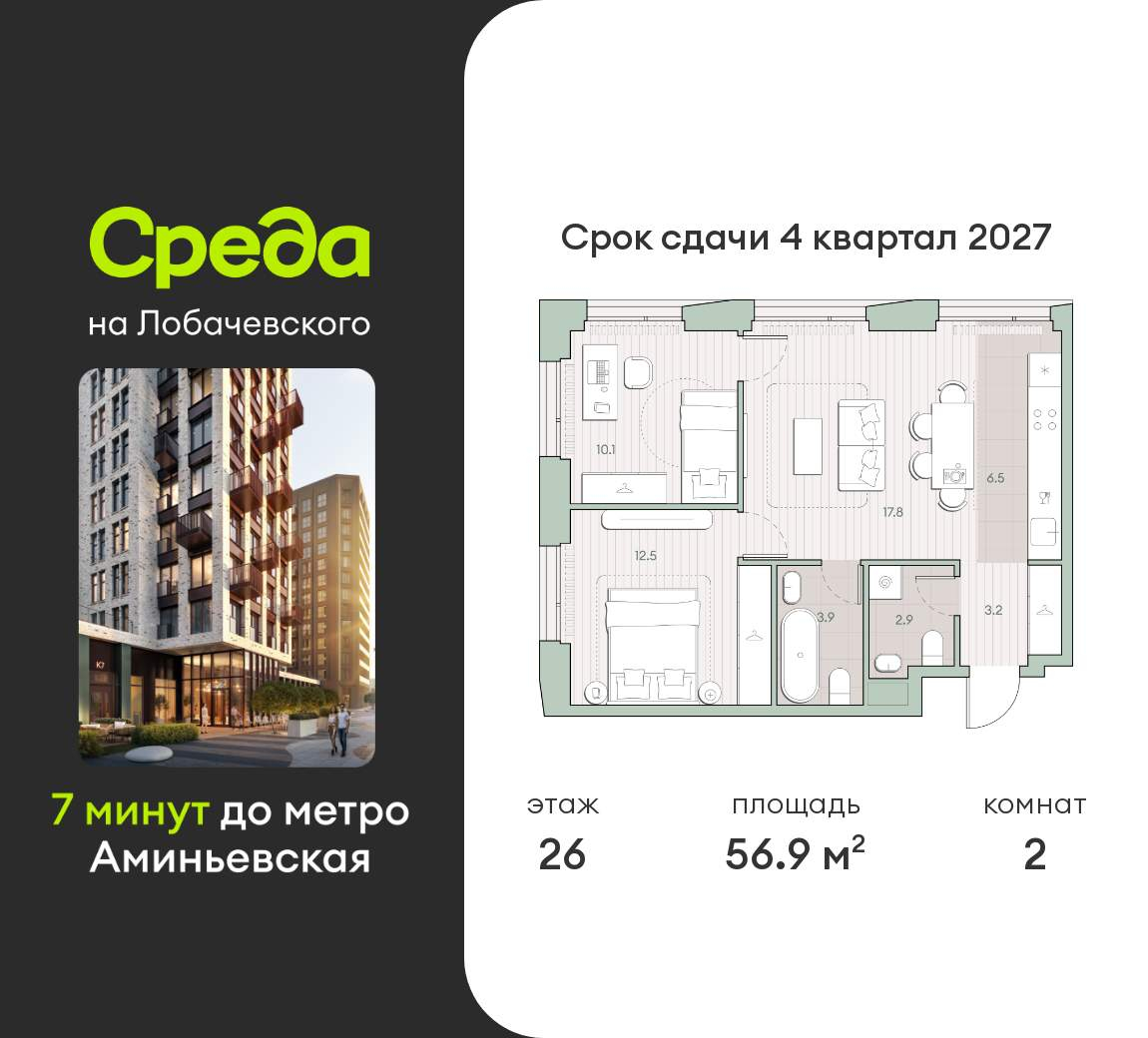 Купить 2к квартиру 56 м² в ЖК Среда на Лобачевского