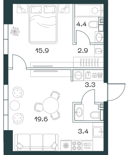 2 совмещенных санузла. В жилой зоне 2 больших окна на одну сторону, хорошая инсоляция.