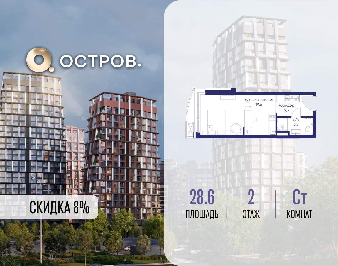 Продаётся квартира от застройщика: общая площадь 28.60 м, жилая 14.60 м, кухня 5.00 м, 2-й этаж, жилой квартал «Остров 14», корпус 1 (секция 2) . Срок сдачи: 2 квартал 2029 года.