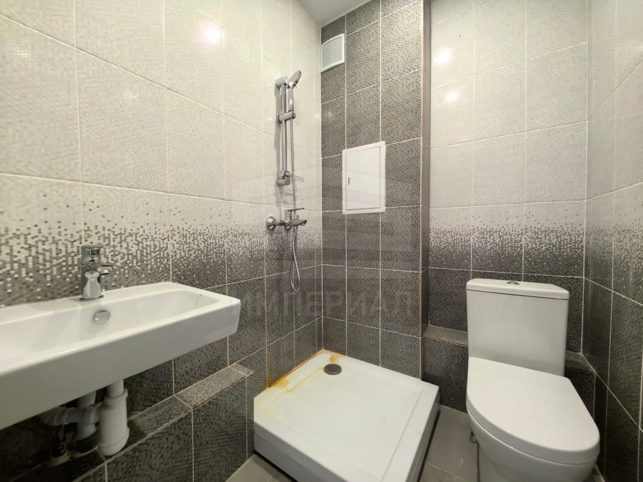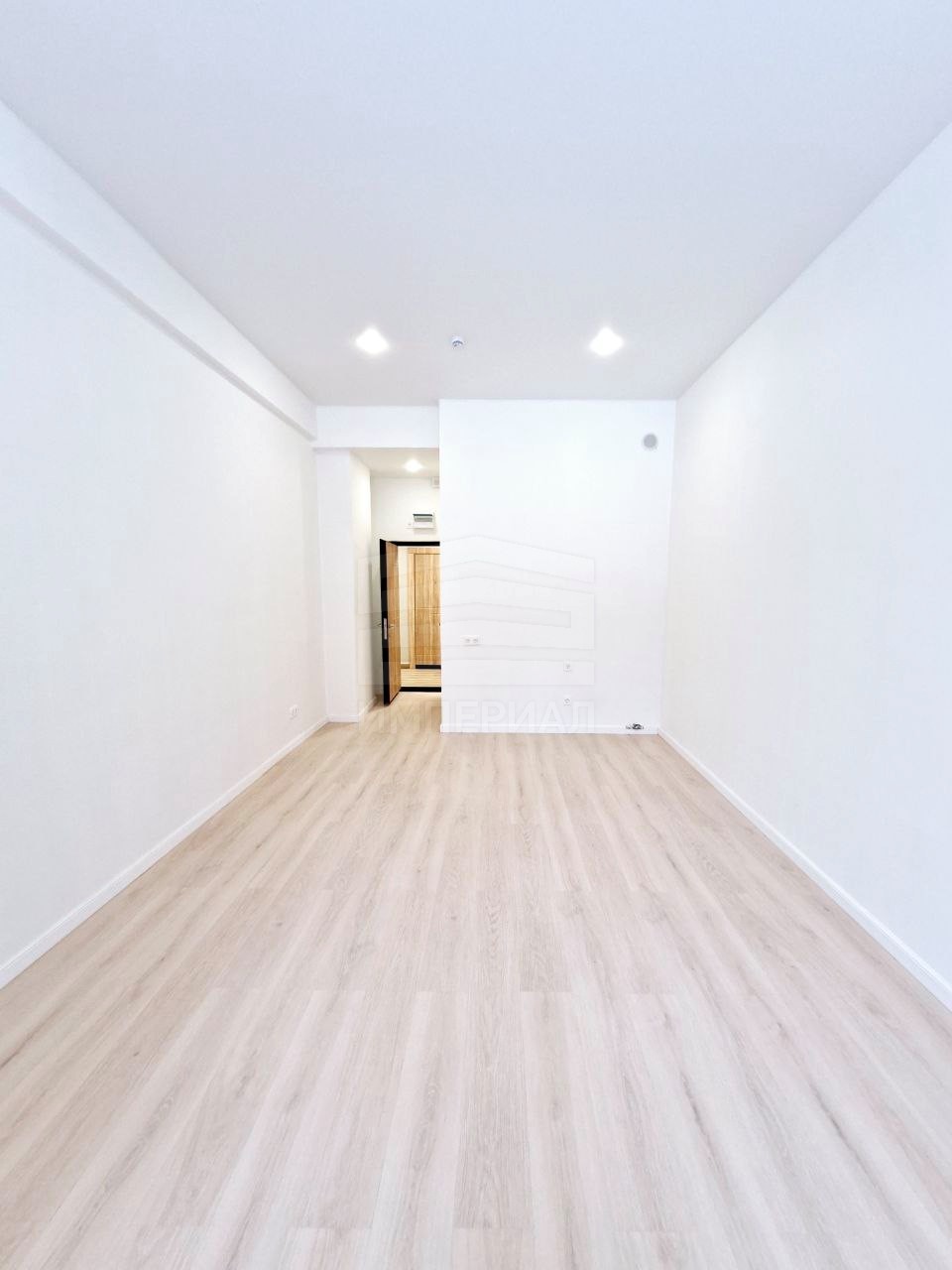 На стенах поклеены обои под покраску, на полу постелен ламинат с плинтусами и откосами. Есть вытяжная вентиляция в санузле и на кухне, выходы хв/гв, место под раковину на кухне. Кроме того, в помещениях уже есть выключатели освещения, розетки для бытовой техники и роутера, а также сделаны закладные для оптоволокна для интернета.