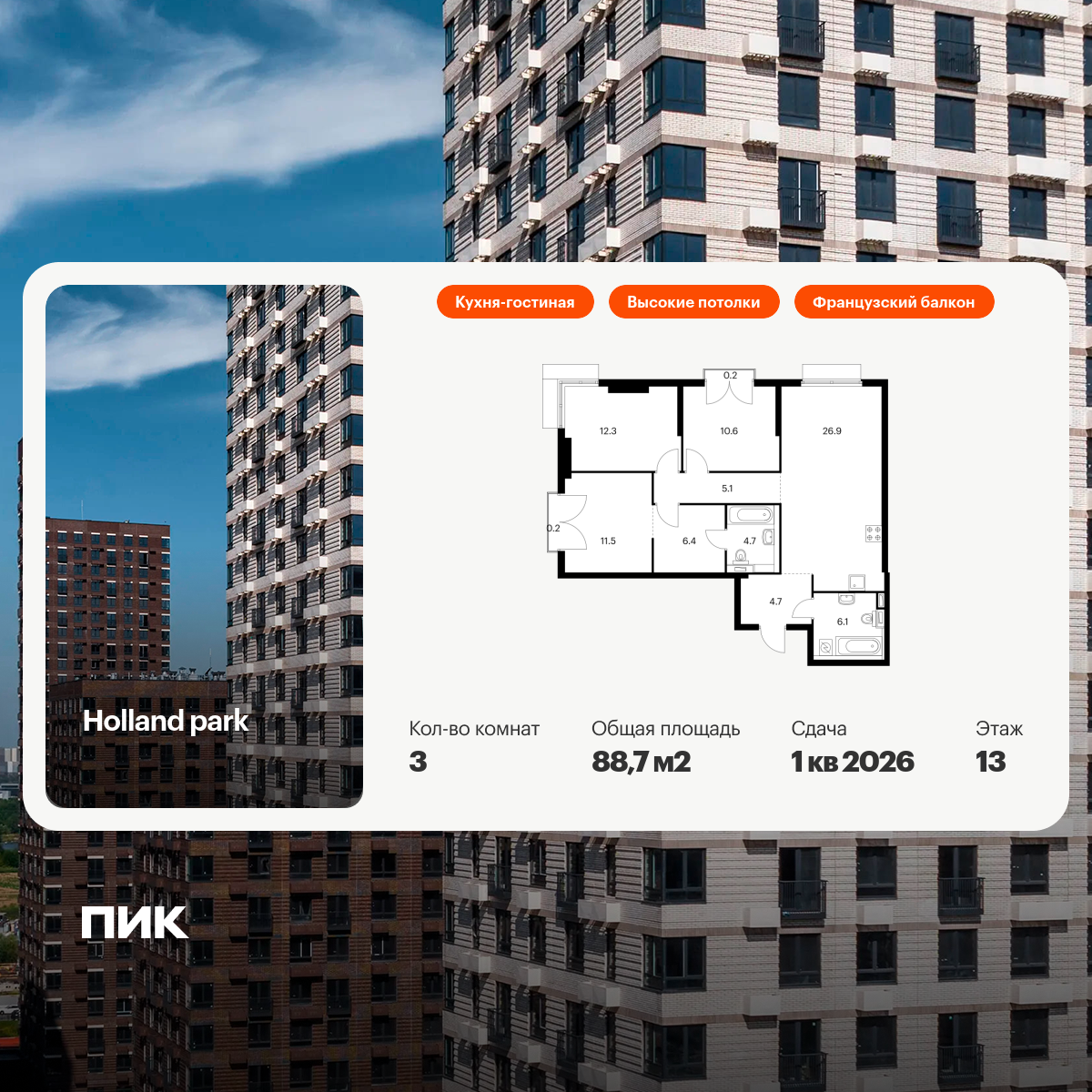 Продаётся 2-комнатная квартира от застройщика: общая площадь 74.70 м, жилая м, кухня м, 13-й этаж, жилой квартал «Событие-6», корпус 1 (секция 1) Срок сдачи: 4 квартал 2029 года.
