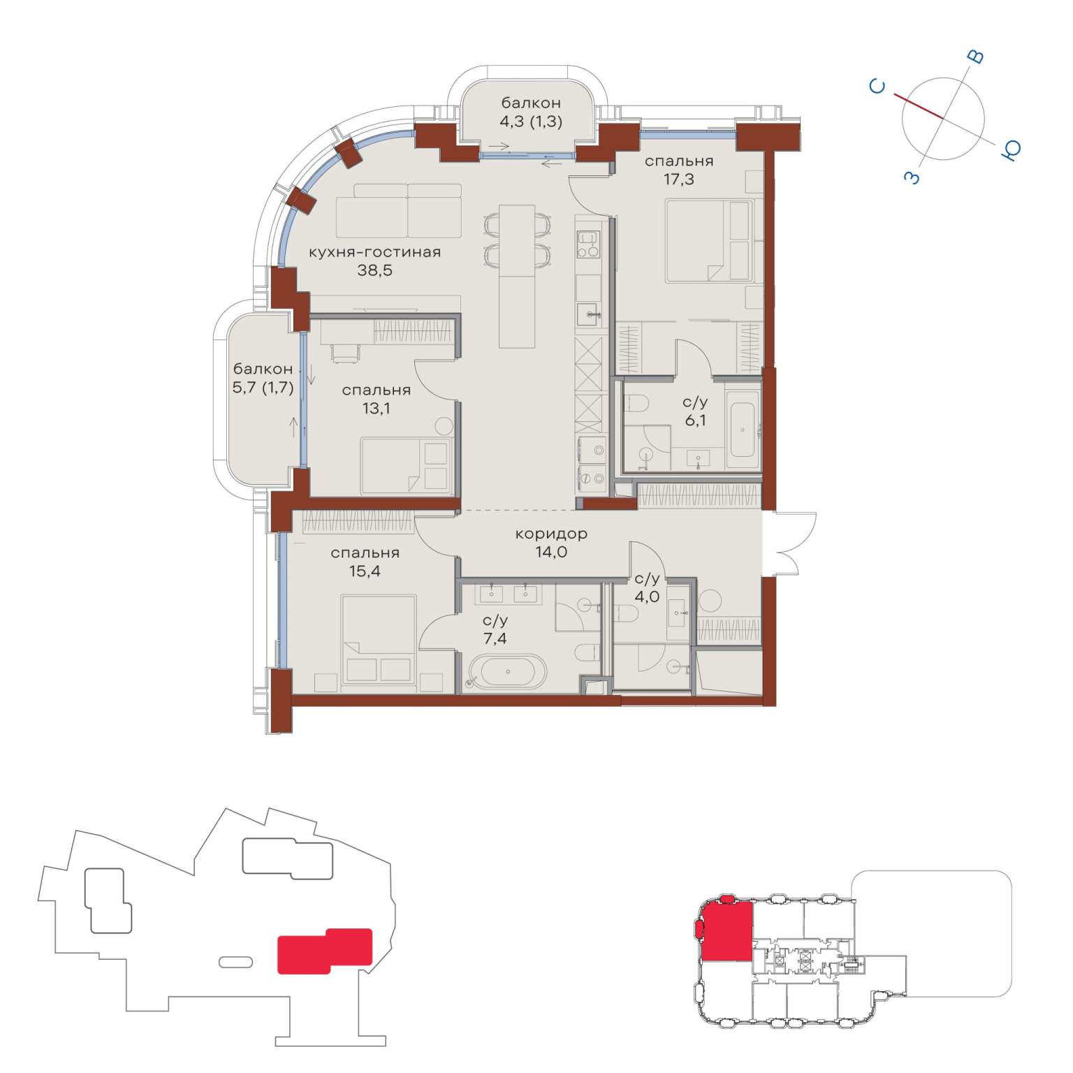 Жилая площадь 104 м2, кухня 55 м2, квартира без отделки, комнаты изолированные, совмещенных санузлов - 1, балконов - 1.